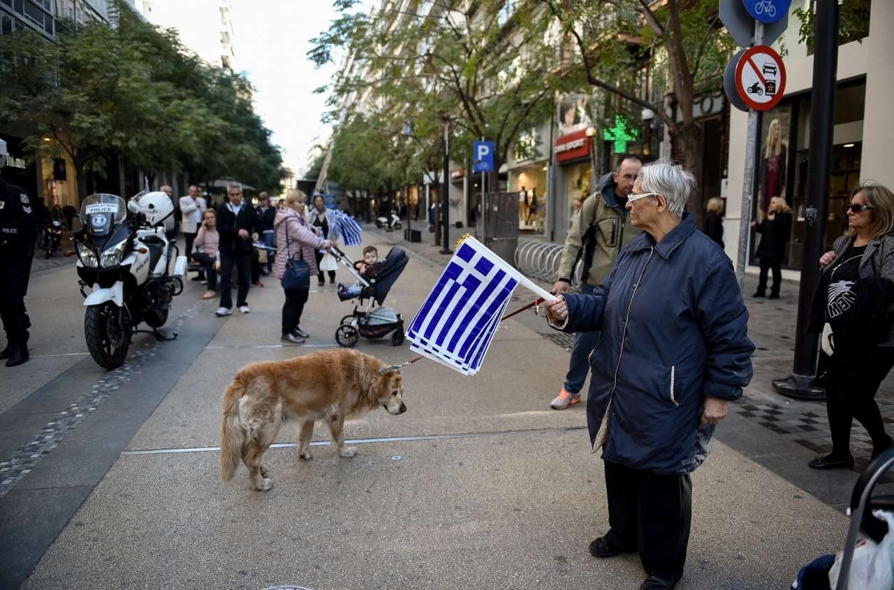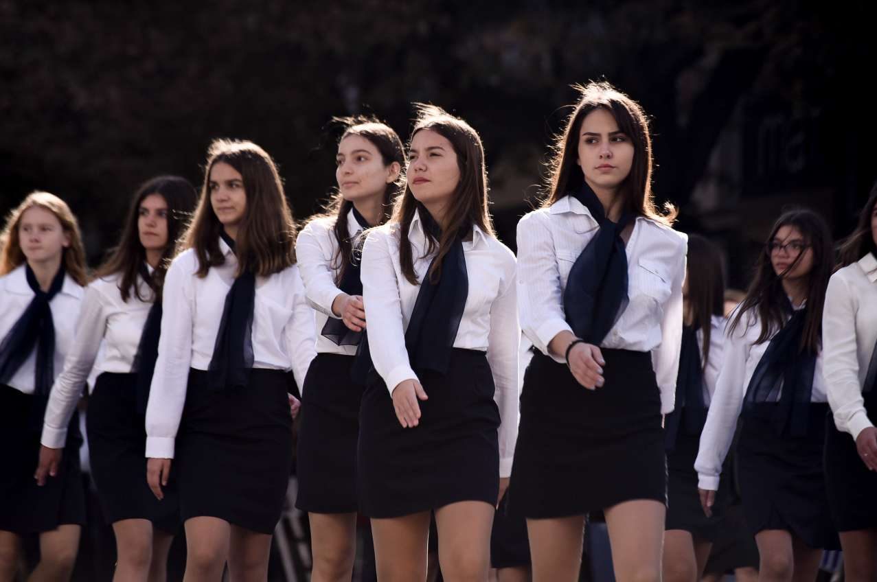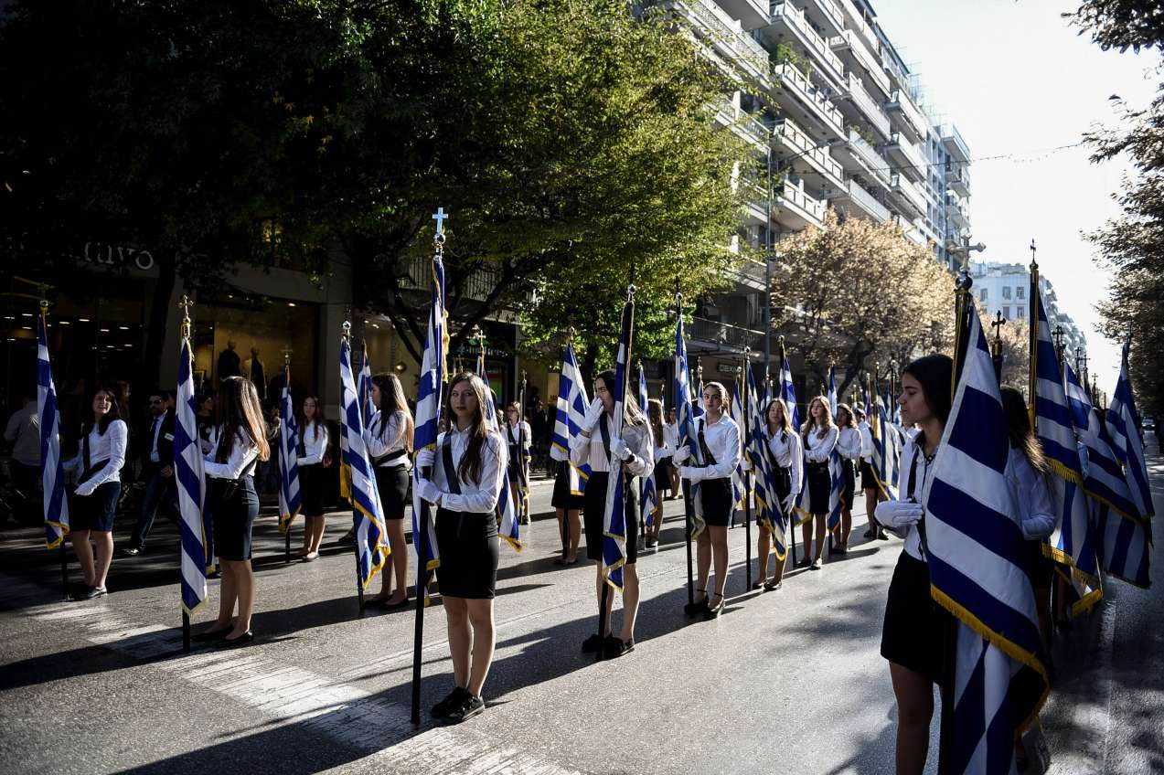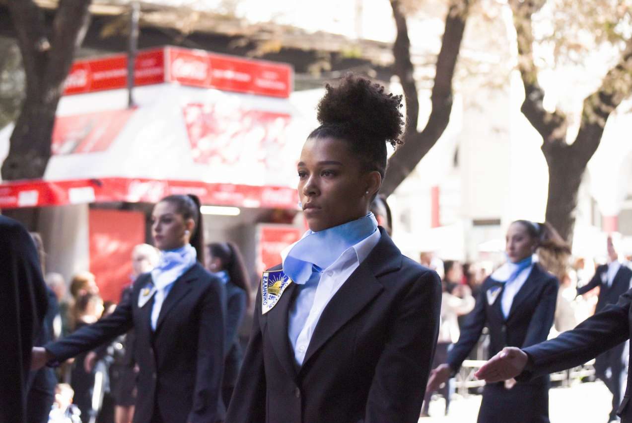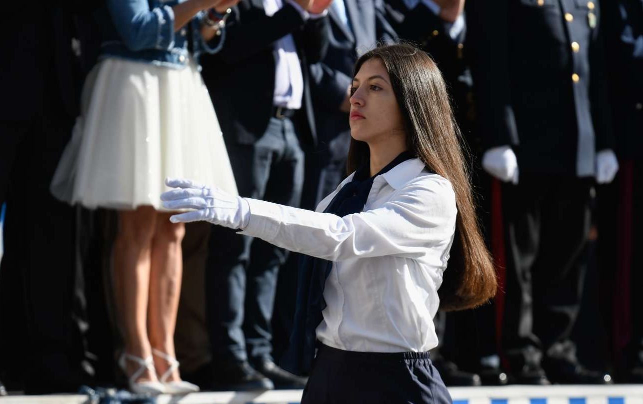 Με παράστημα και ύφος που αρμόζει στην περίσταση η μαθήτρια παρελαύνει - με φόντο τη φουστίτσα της Πατουλίδου