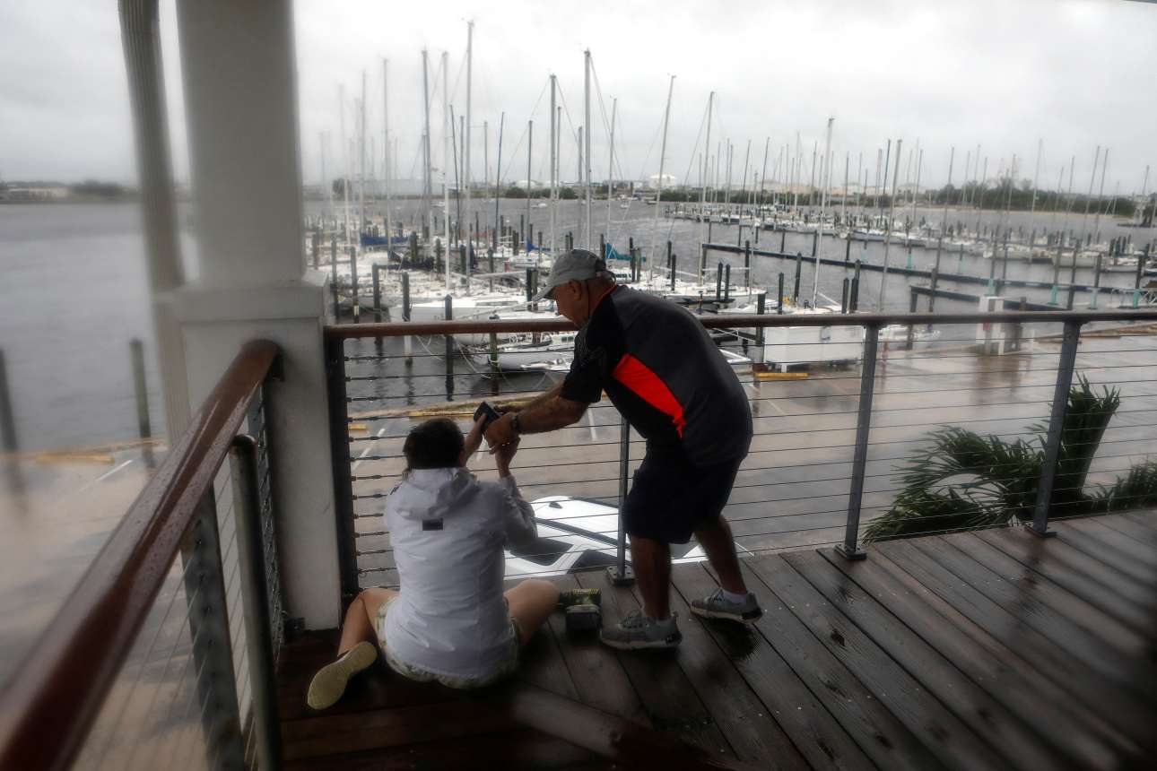 Ενα ζευγάρι προσπαθεί να στήσει μια κάμερα στο λιμάνι της Τάμπα, προκειμένου να καταγράψει το πέρασμα του τυφώνα