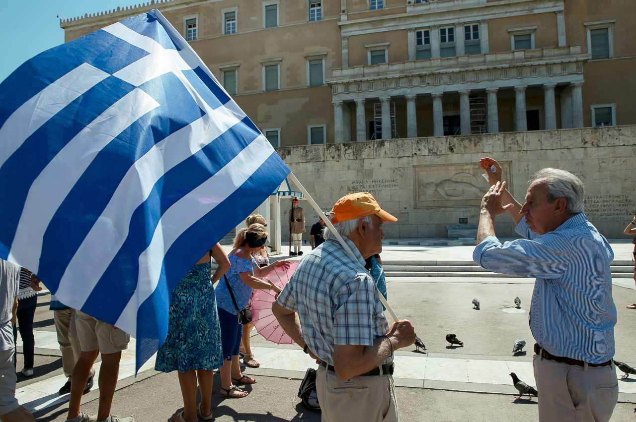 Οι διαδηλωτές άνοιξαν μια τεράστια μπλε σημαία, με έναν άσπρο σταυρό στην μέση, στο μνημείο του Αγνωστου Στρατιώτη