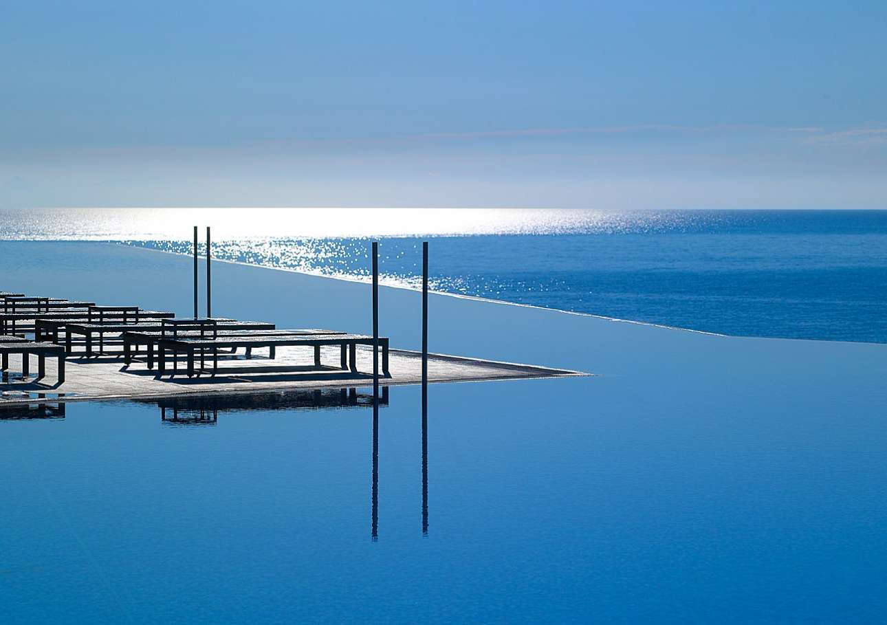 Η μοναδική πισίνα του Michelangelo στην Κω απλώνεται μέχρι τον ορίζοντα, προσφέροντας ειδυλλιακή θέα στη Νίσυρο