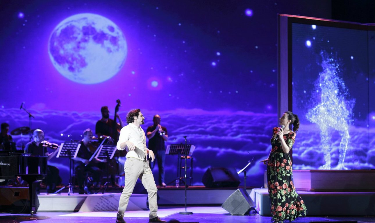 Οι δύο παρουσιαστές της βραδιάς, ο Οδυσσέας Παπασπηλιόπουλος και η Μαρίζα Ρίζου στη σκηνή του Παλλάς