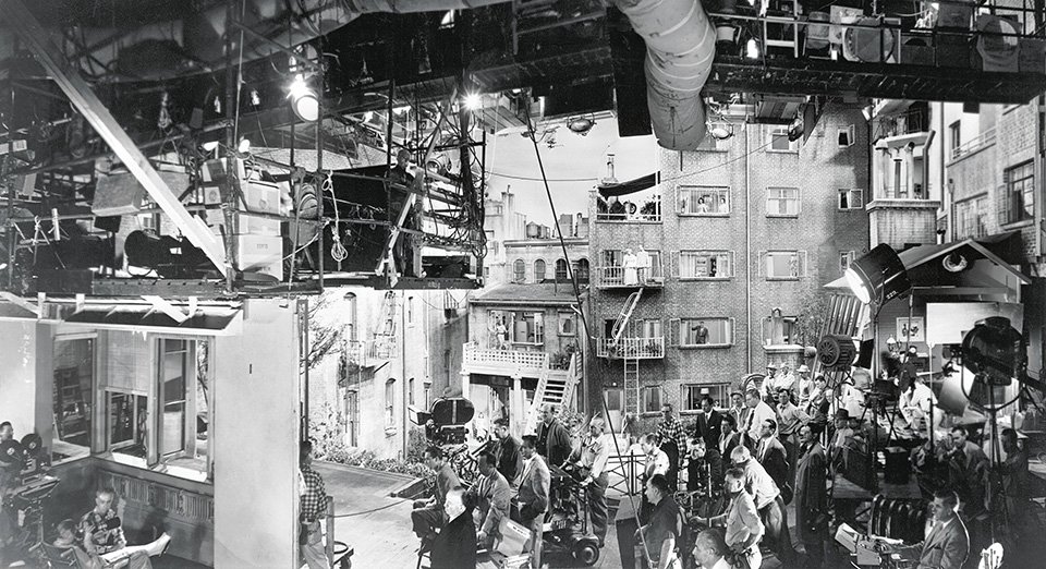 «Σιωπηλός μάρτυρας» (Rear Window), 1954. Μία εκπληκτική φωτογραφία που δείχνει την τεχνολογία και το σύνολο των ανθρώπων που συμμετείχαν στην παραγωγή ώστε να γυριστεί ο «Σιωπηλός μάρτυρας», μία ταινία που διαδραματίζεται σε ένα μόνο κινηματογραφικό σετ. Στο κέντρο διακρίνεται ο Χίτσκοκ που παρακολουθεί τον Τζέιμς Στιούαρτ (τέρμα αριστερά)