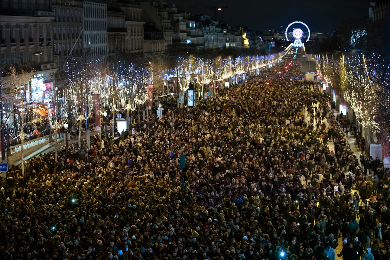 Πολύς κόσμος, αλλά όχι και τόσο πολύς ώστε να γεμίσει ασφυκτικά τον χώρο, γιορτάζει το 2018 στα Ηλύσια Πεδία, στο Παρίσι