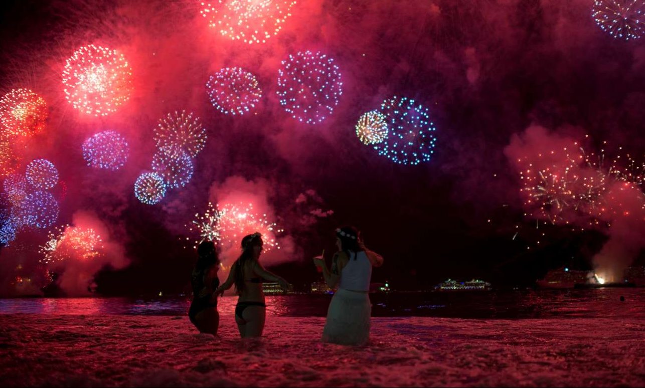 Νυχτερινό μπάνιο στην Κοπακαμπάνα, τη θρυλική παραλία του Ρίο ντε Τζανέιρο, όπου το νέο έτος μπαίνει καλοκαίρι. Και με πολλά πυροτεχνήματα