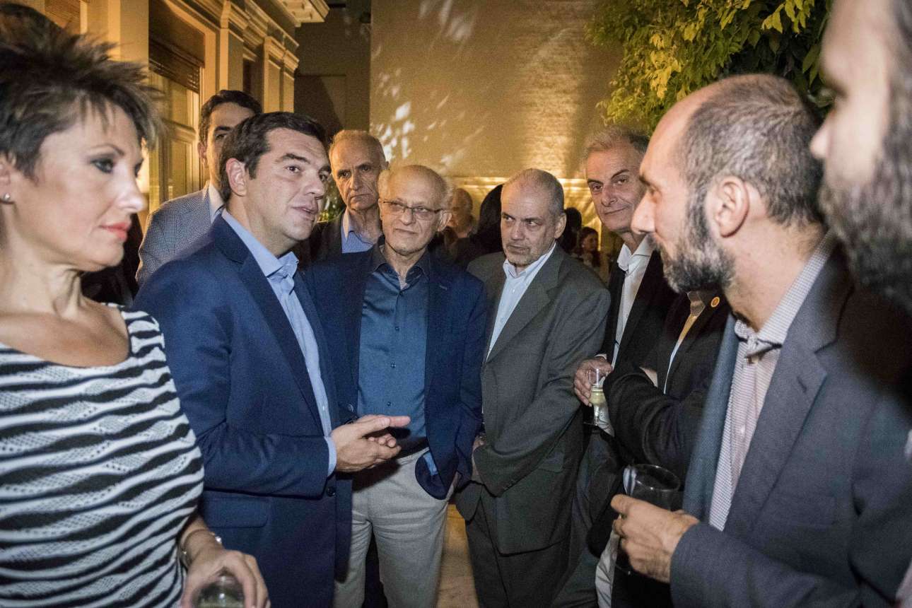 Ο Αλέξης Τσίπρας στον κήπο του Μαξίμου συνομιλεί με βουλευτές. Δίπλα του η Αννέτα Καββαδία και αριστερά του ο Σπύρος Λάππας από την Καρδίτσα