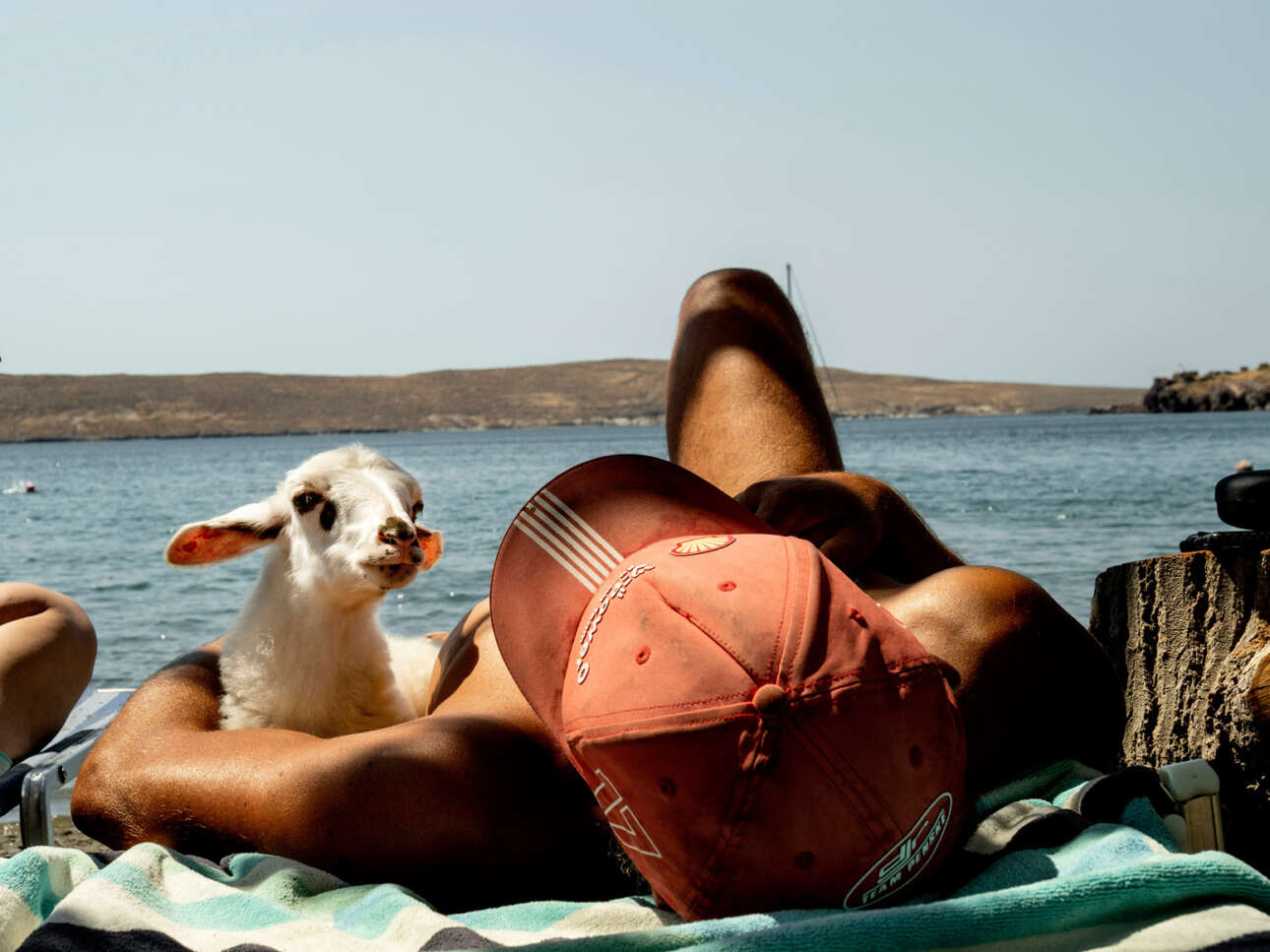 Το κατσικάκι Λάμπης και ο Σπύρος με φόντο το Αιγαίο, τον περασμένο Αύγουστο. «Ο Σπύρος ήρθε στο νησί μετά από burnoυt από τη δουλειά του. Στην πιο έρημη περιοχή του νησιού, συνάντησε τον Λάμπη, ένα αρνάκι με τραυματισμένο πόδι. Ακολουθώντας τις συμβουλές των ντόπιων βοσκών, αυτή τη στιγμή το φροντίζει για να γίνει πάλι καλά. Οι δύο τους κολυμπούν καθημερινά προς τη θεραπεία»