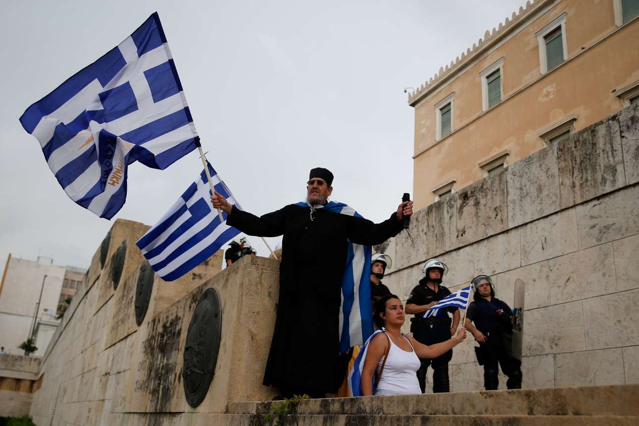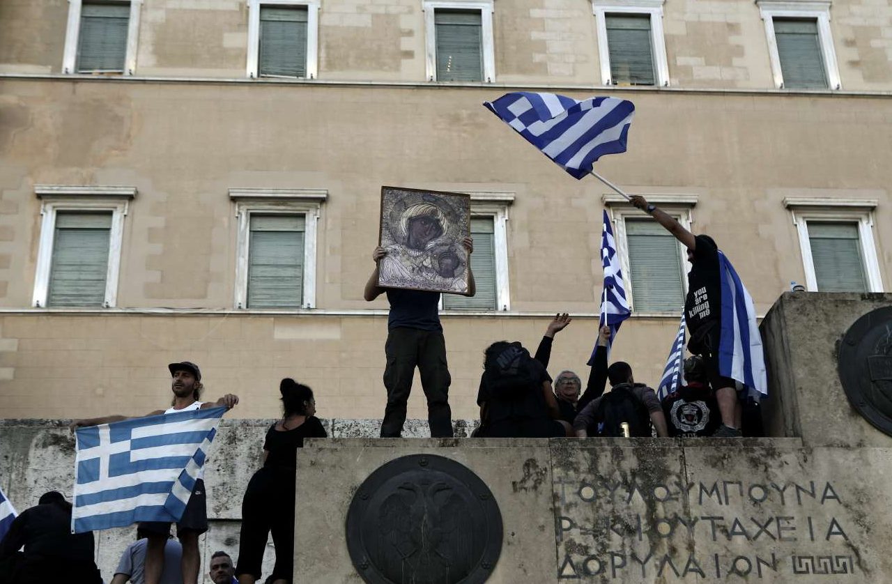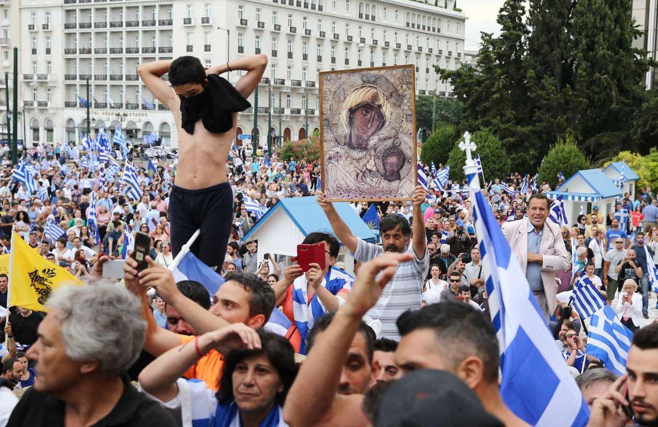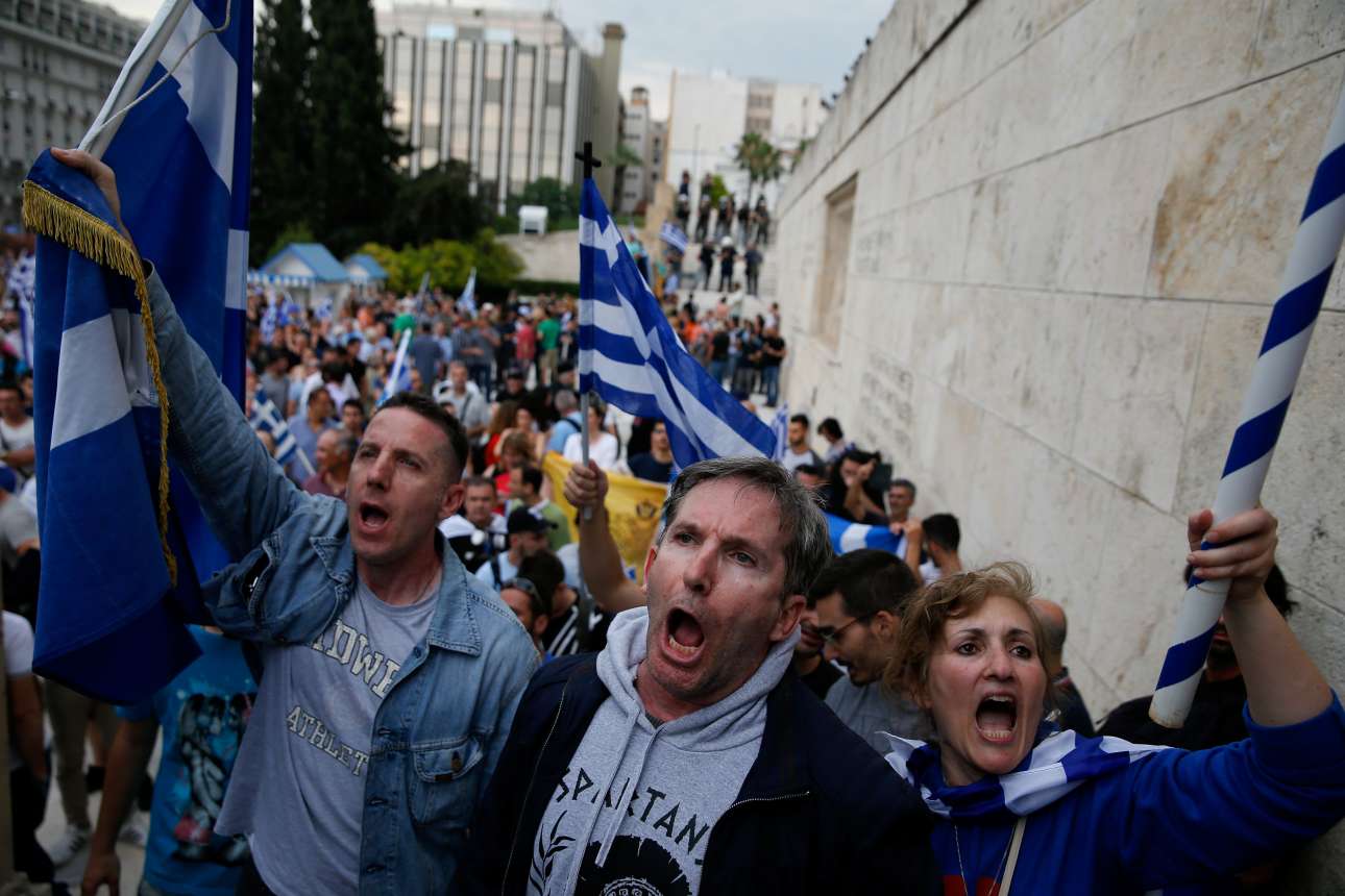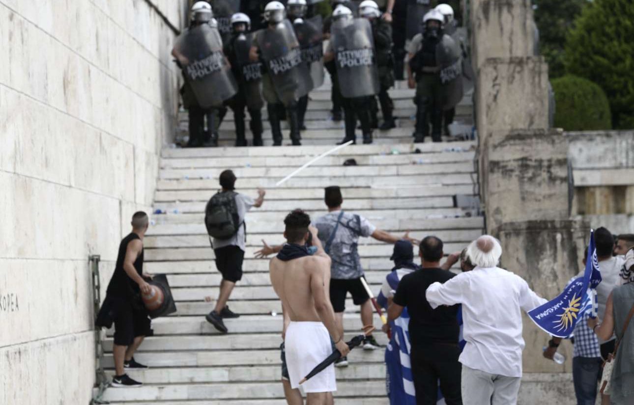Ενα πυκνό και ιδιαίτερα μαχητικό πλήθος συγκεντρώθηκε νωρίς το βράδυ του Σαββάτου στο Σύνταγμα για να διαδηλώσει έξω από το κοινοβούλιο ενώ συζητείτο η πρόταση μομφής κατά της κυβέρνησης για το Μακεδονικό. Δεν έλειψαν τα επεισόδια, ούτε και οι ιδιαίτερες φιγούρες