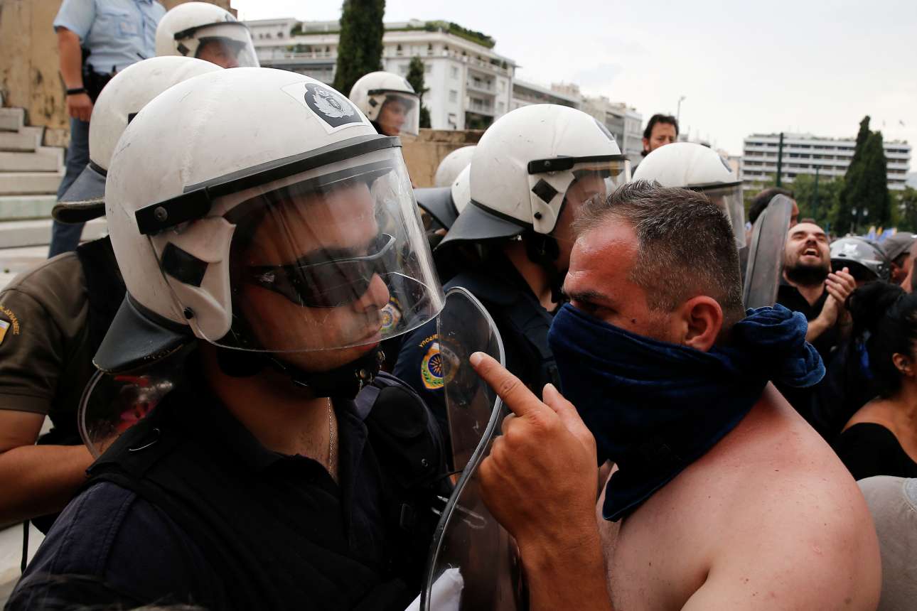 Τα ΜΑΤ εμποδίζουν τους διαδηλωτές από το να εισβάλουν στον περίβολο της Βουλής