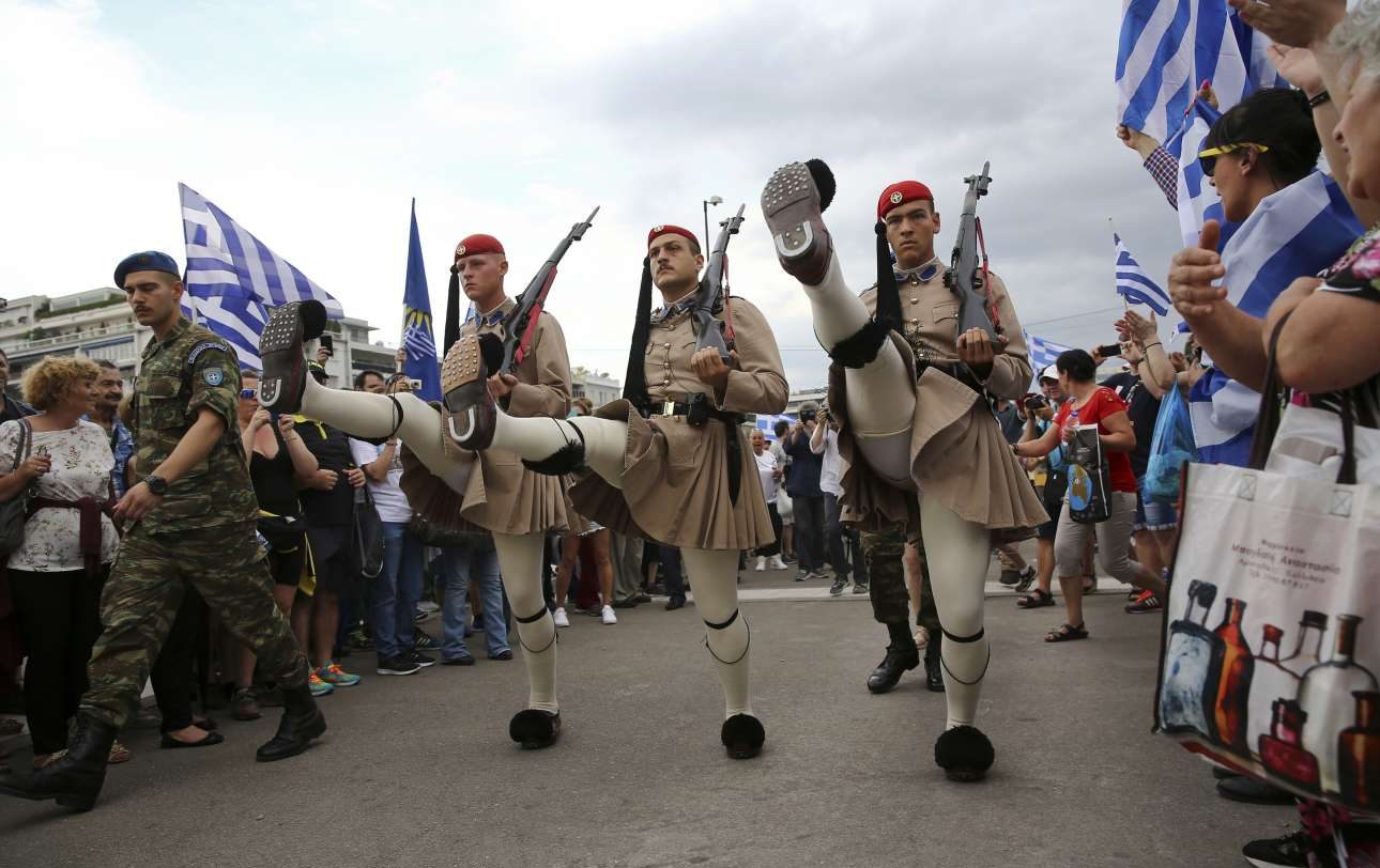 Οι εύζωνοι της Προεδρικής Φρουράς με τον χαρακτηριστικό βηματισμό περνούν ανάμεσα από τους διαδηλωτές
