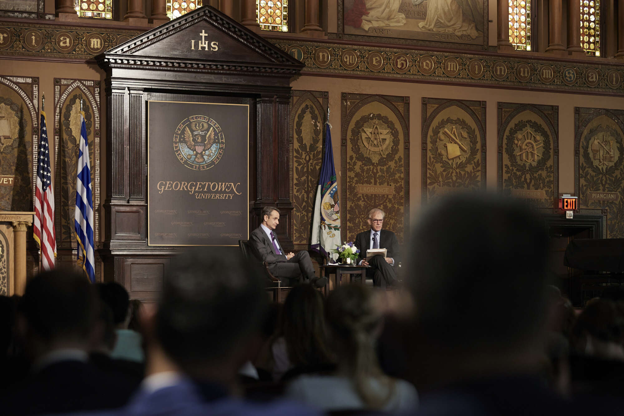 Στιγμιότυπο από την ανοικτή συζήτηση που είχε ο Πρωθυπουργός με τον δημοσιογράφο Ντέιβιντ Ιγκνάτιους, της Washington Post, στο Πανεπιστήμιο του Τζορτζτάουν
