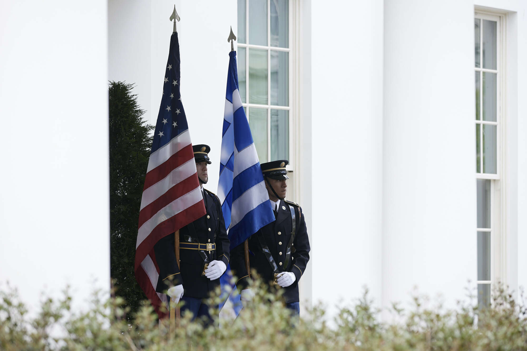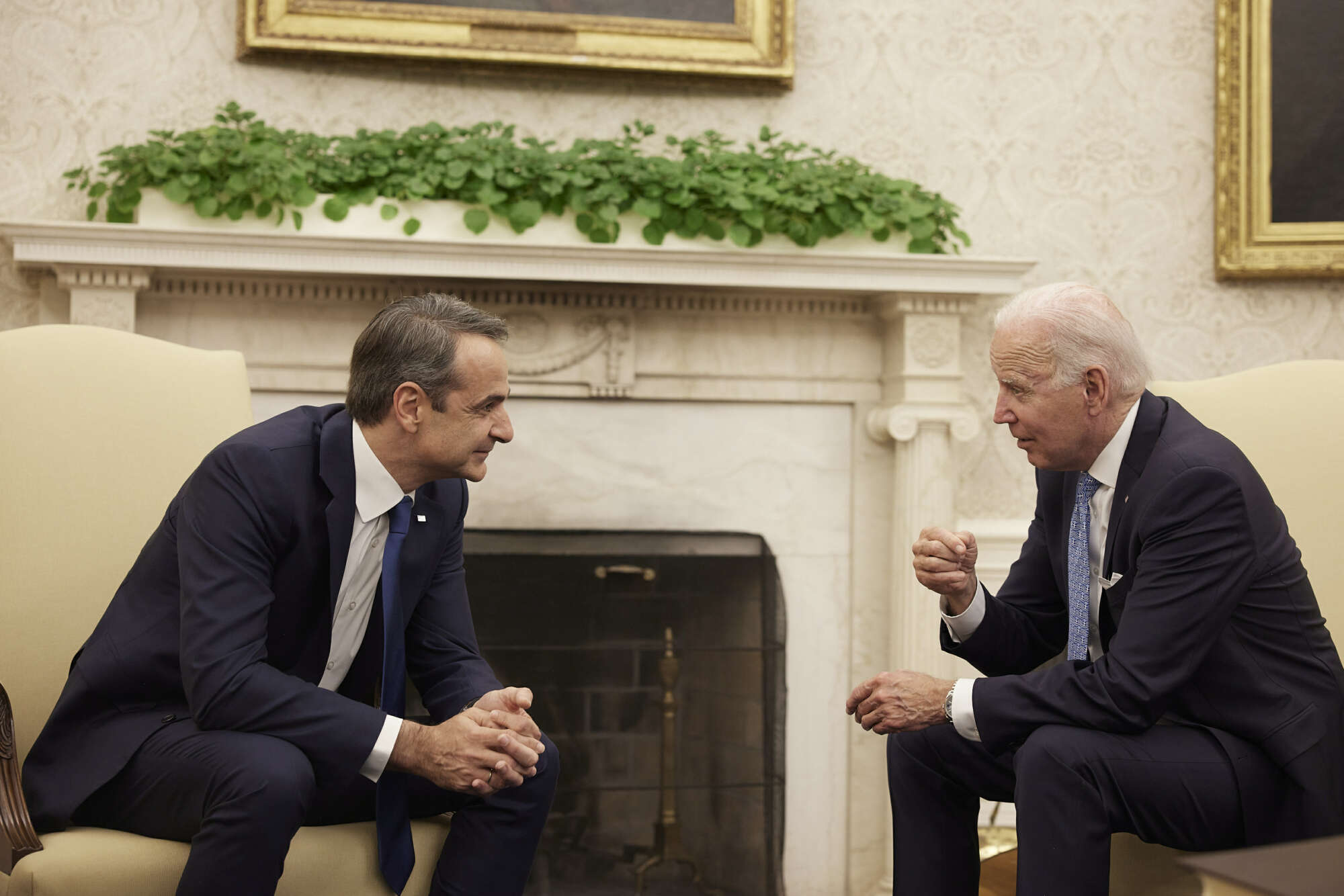 Η συζήτηση των δύο ανδρών συνεχίστηκε σε ιδιαίτερο θερμό κλίμα και εντός του Λευκού Οίκου. Διακρίνεται η γραβάτα του Μπάιντεν με τις ελληνικές σημαίες που έκλεψε τις εντυπώσεις