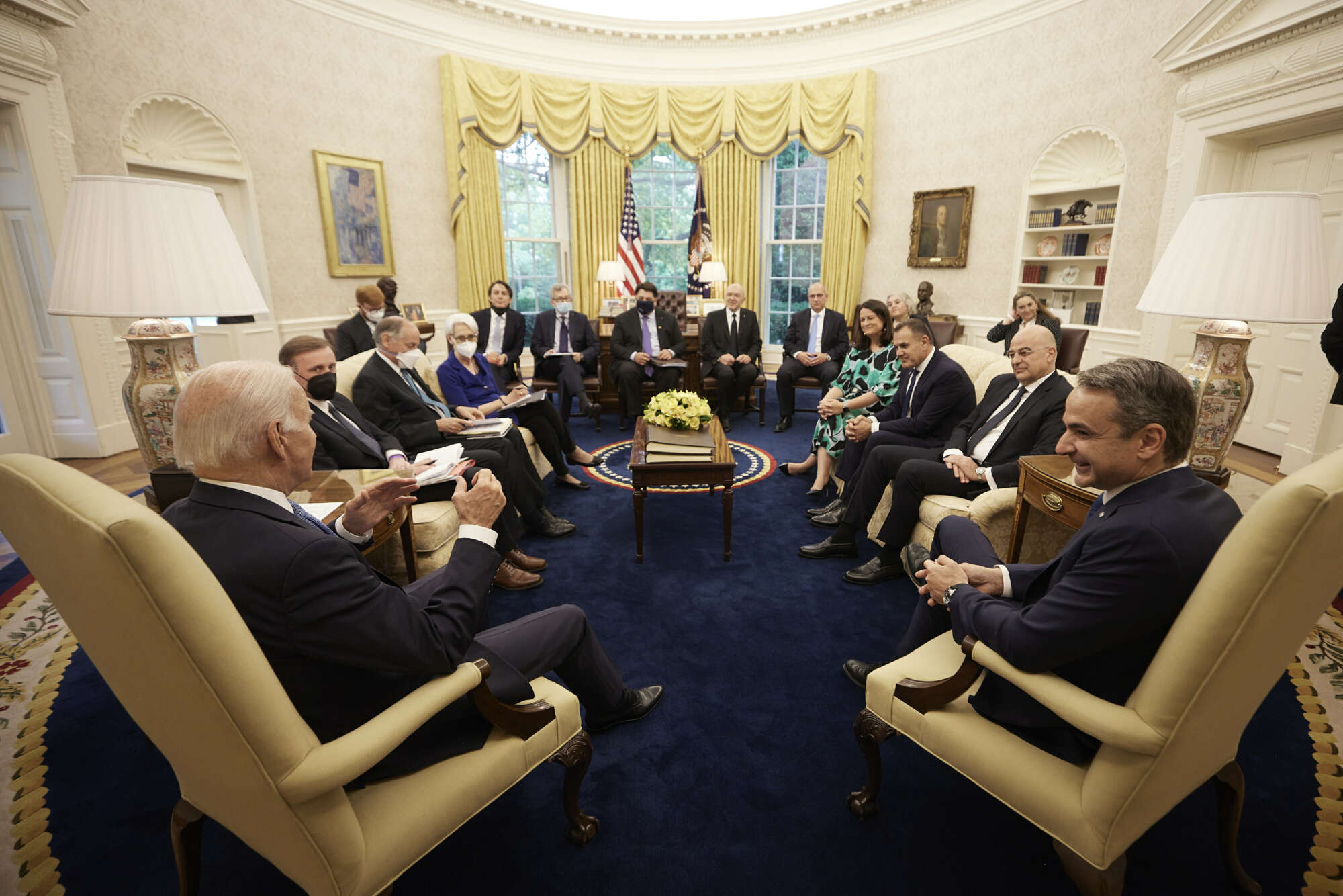 Νίκη Κεραμέως, Νίκος Παναγιωτόπουλος και Νίκος Δένδιας μαζί με τον Κυριάκο Μητσοτάκη και απέναντι από τον Τζο Μπάιντεν και την αμερικανική αντιπροσωπεία στο Οβάλ Γραφείο