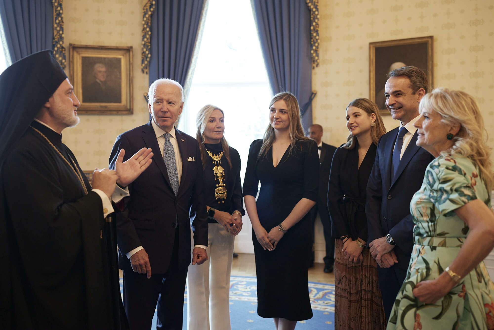 Ο αρχιεπίσκοπος Αμερικής Ελπιδοφόρος, ο οποίος βρέθηκε μεταξύ των καλεσμένων στη δεξίωση που παρέθεσε ο πρόεδρος των ΗΠΑ, συζητά με το ζεύγος Μπάιντεν και την οικογένεια Μητσοτάκη