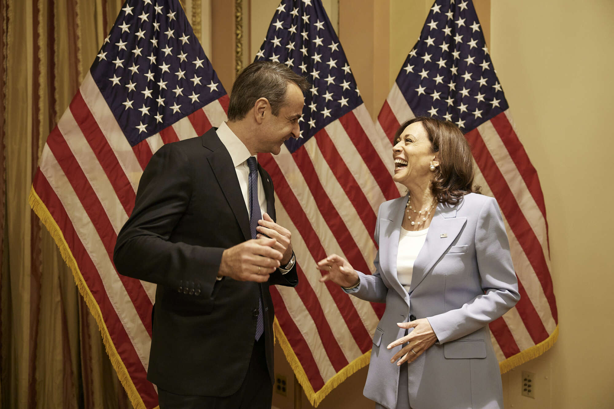 Η αντιπρόεδρος, Κάμαλα Χάρις, συγχαίρει από κοντά τον έλληνα Πρωθυπουργό, μετά το πέρας της ομιλίας του στο Κογκρέσο