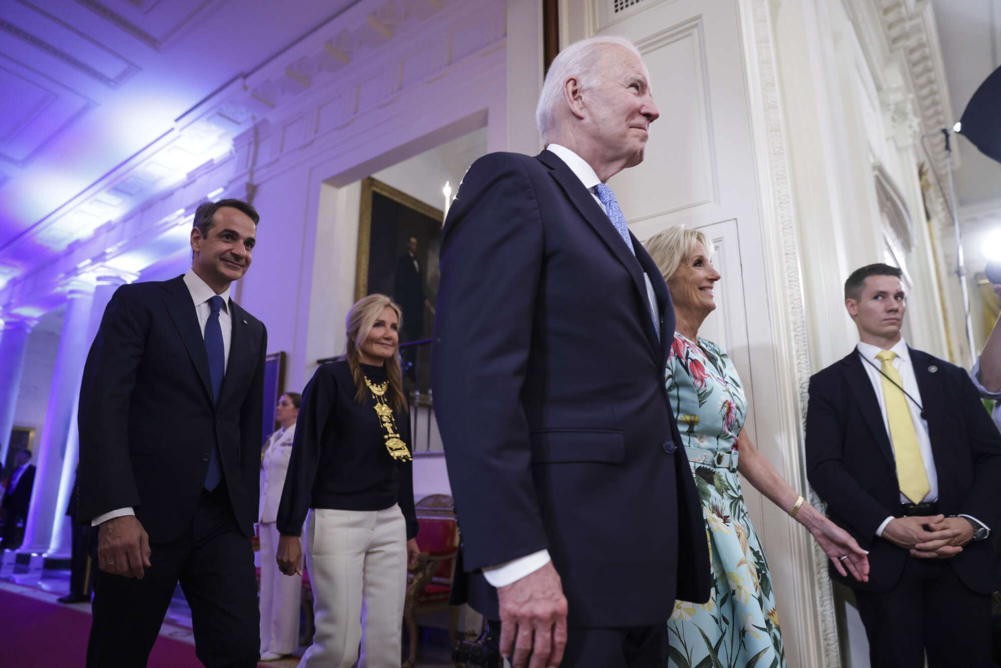Καθ' οδόν για τη δεξίωση στον Λευκό Οίκο. Προπορεύονται Τζιλ και Τζο Μπάιντεν, ακολουθεί το ζεύγος Μητσοτάκη