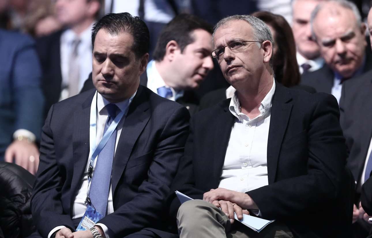 Ο αντιπρόεδρος της ΝΔ Αδωνις Γεωργιάδης αγκαλιάζει τον πρώην υπουργό Δικαιοσύνης Χαράλαμπο Αθανασίου