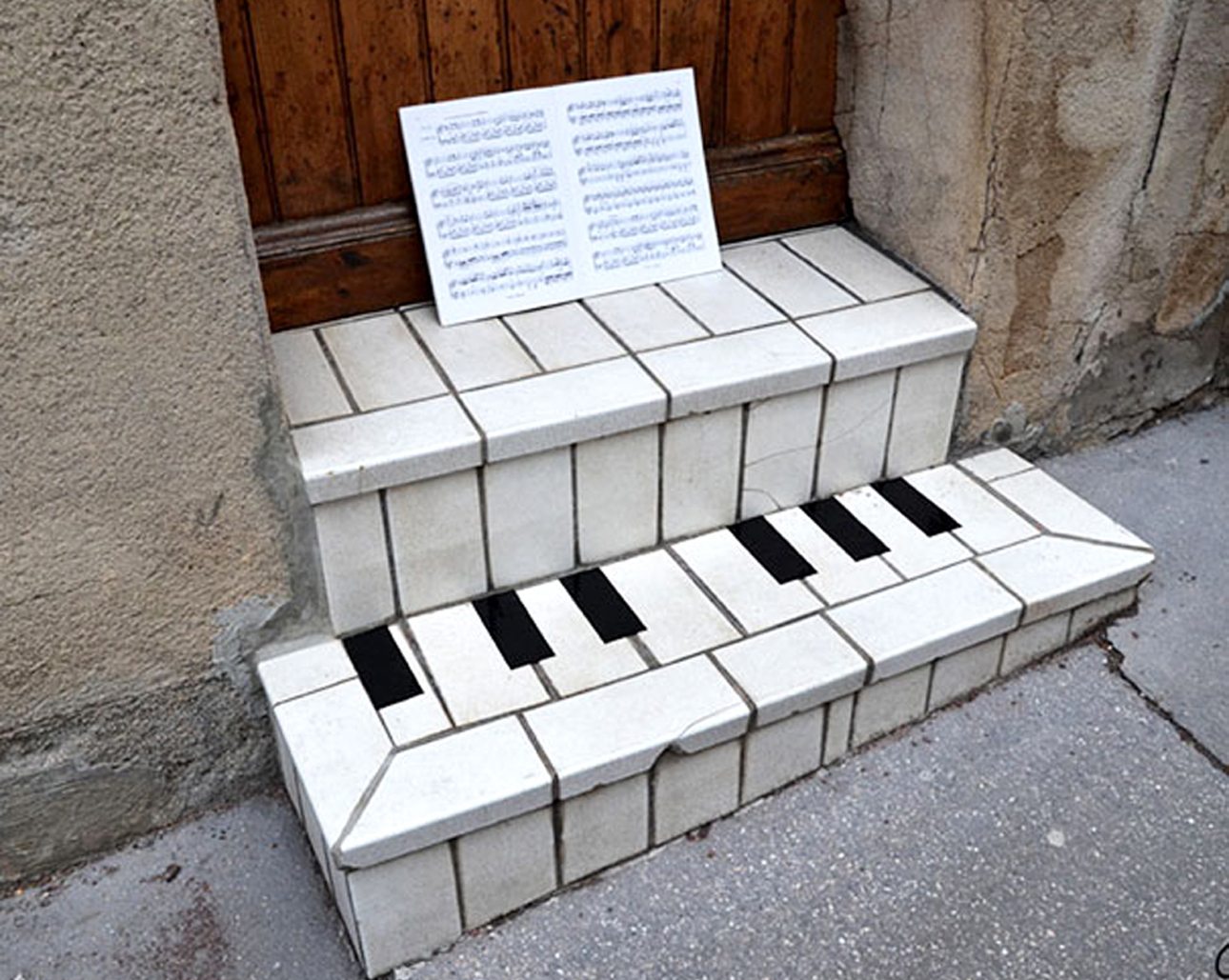 Οι παρτιτούρες μαζί με την ξύλινη πόρτα και τα λευκά σκαλοπάτια, δημιουργούν ένα πολύ αληθοφανές πιάνο