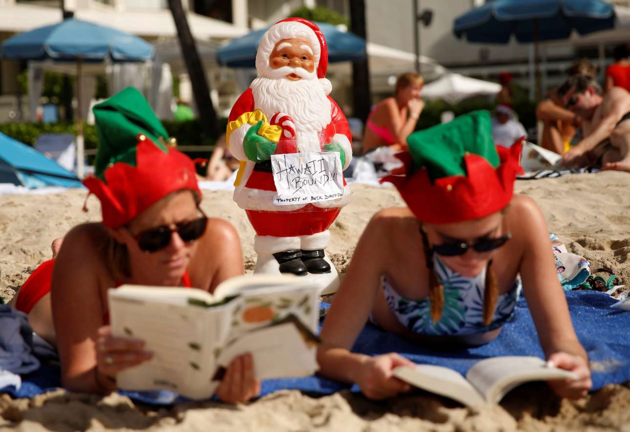 Ηλιοθεραπεία και φιλαναγνωσία στην παραλία Γουαϊκίκι στην Χονολουλού της Χαβάη, ανήμερα Χριστούγεννα