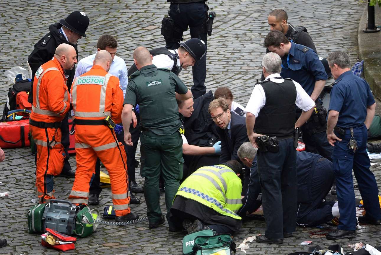 Αστυνομικοί, γιατροί και πολιτικοί σπεύδουν να βοηθήσουν τον αστυνομικό που ξεψυχάει έξω από το βρετανικό κοινοβούλιο, μετά το τρομοκρατικό χτύπημα που σημειώθηκε τον περασμένο Μάρτιο