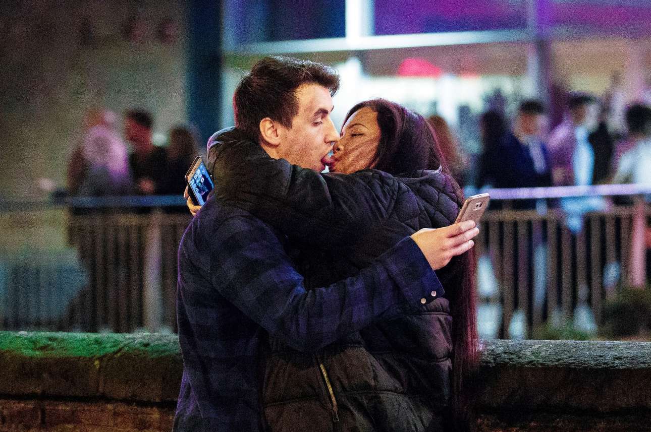 Ο έρωτας στα χρόνια της...τεχνολογίας. Ενα ζευγάρι φιλιέται -χωρίς να αφήσει τα κινητά από το χέρι- παραμονές Χριστουγέννων στο Μάντσεστερ, θυμίζοντας έντονα το γκράφιτι του Μπάνκσι «Mobile Lovers»