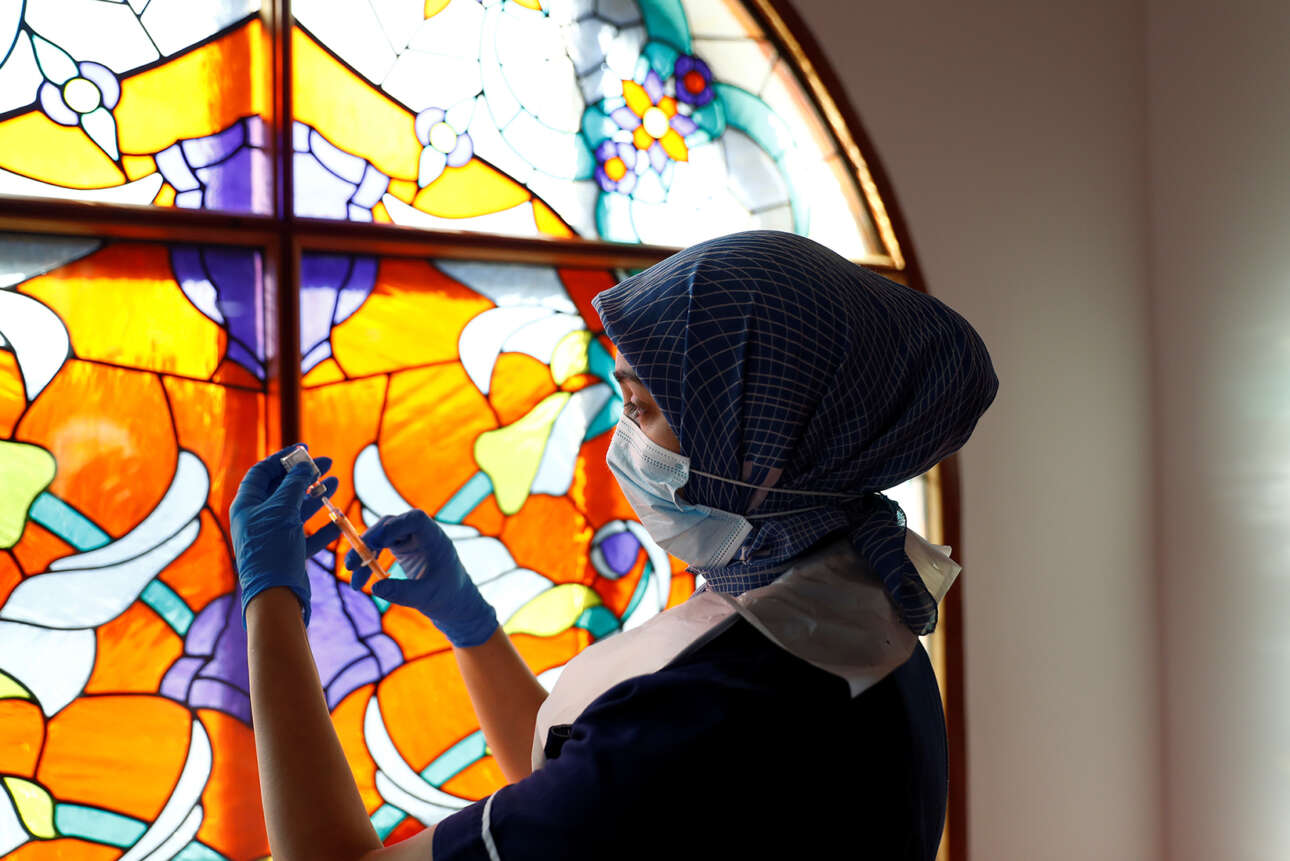 Στο Μπράντφορντ της Βρετανίας, η νοσοκόμα Ζενούμπ Μαχούντ προετοιμάζει μια δόση του εμβολίου AstraZeneca στο Κεντρικό Τζαμί του Μπράντφορντ