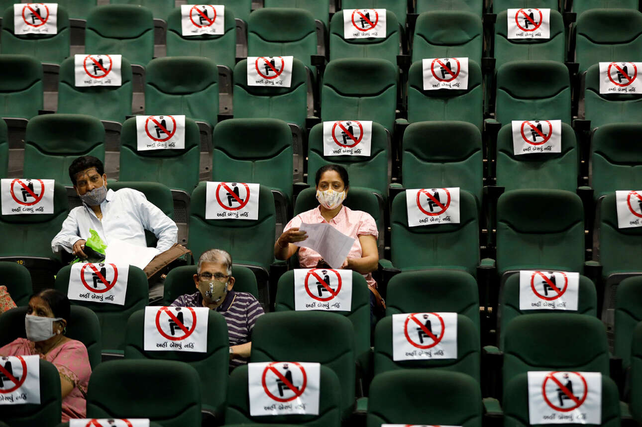 Στo Αχμενταμπάντ της Ινδίας, σε ένα αμφιθέατρο το οποίο έχει μετατραπεί σε προσωρινό κέντρο εμβολιασμού, άνθρωποι παρακολουθούνται μετά τη λήψη μιας δόσης COVISHIELD, του εμβολίου που κατασκευάστηκε από το Serum Institute of India