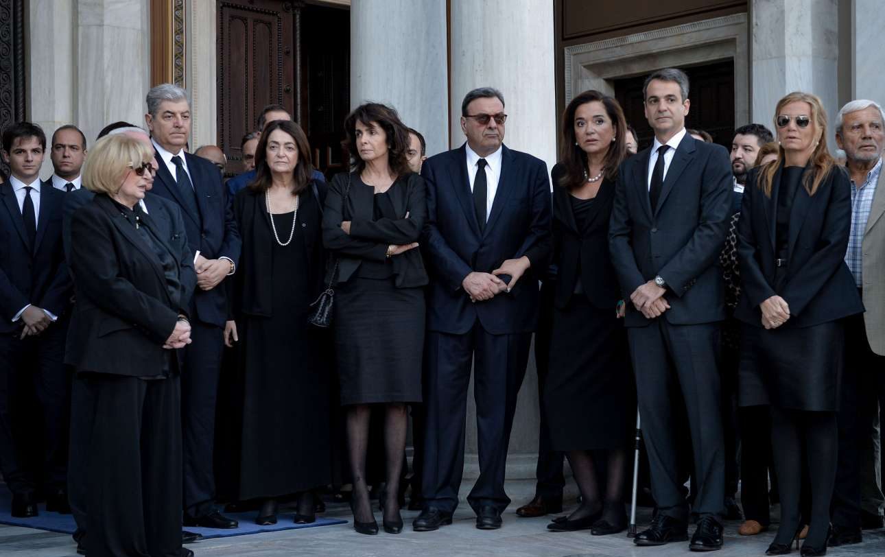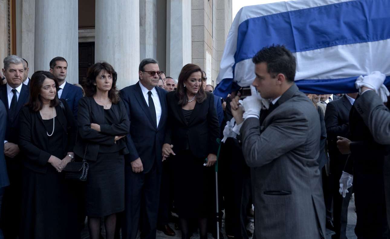 Η οικογένεια μπροστά από το φέρετρο. Η Ντόρα Μπακογιάννη κάθεται καθώς πρόσφατα υποβλήθηκε σε χειρουργική επέμβαση στο πόδι