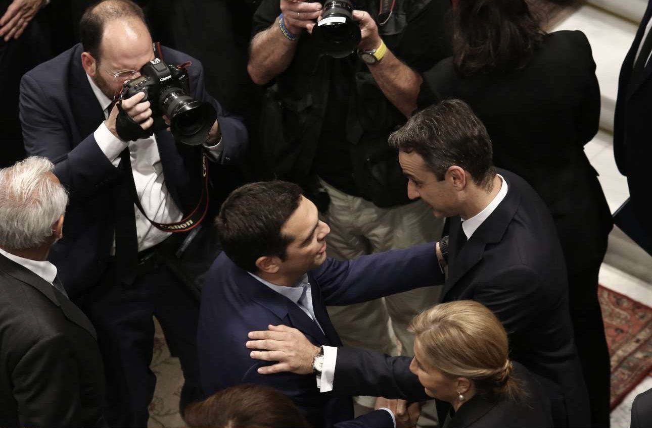 Ο Κυριάκος Μητσοτάκης δέχεται τα συλλυπητήρια από τον κόσμο που έσπευσε από νωρίς στη Μητρόπολη Αθηνών για να αποχαιρετήσει τον Κωνσταντίνο Μητσοτάκη
