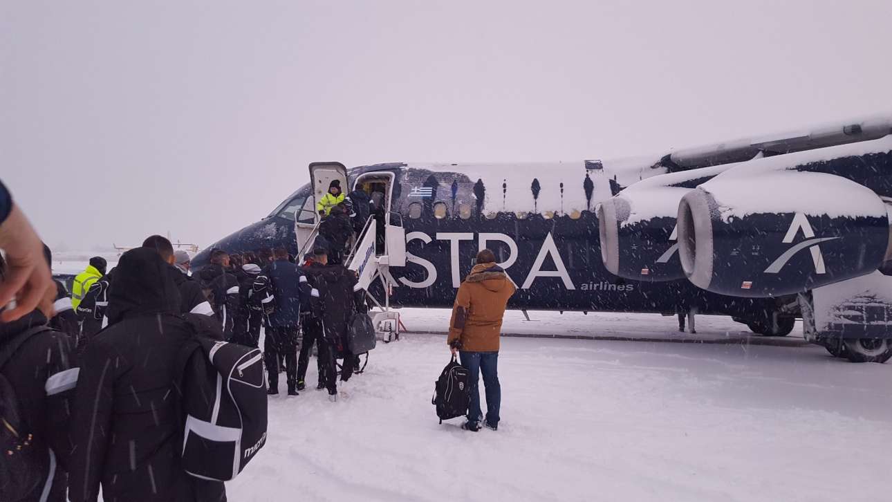 Και η επιβίβαση της ομάδας του ΠΑΟΚ στο χιονισμένο «Μακεδονία» με προορισμό την Αθήνα. Αύριο ο ΠΑΟΚ παίζει με τον Παναιτωλικό για το Κύπελλο