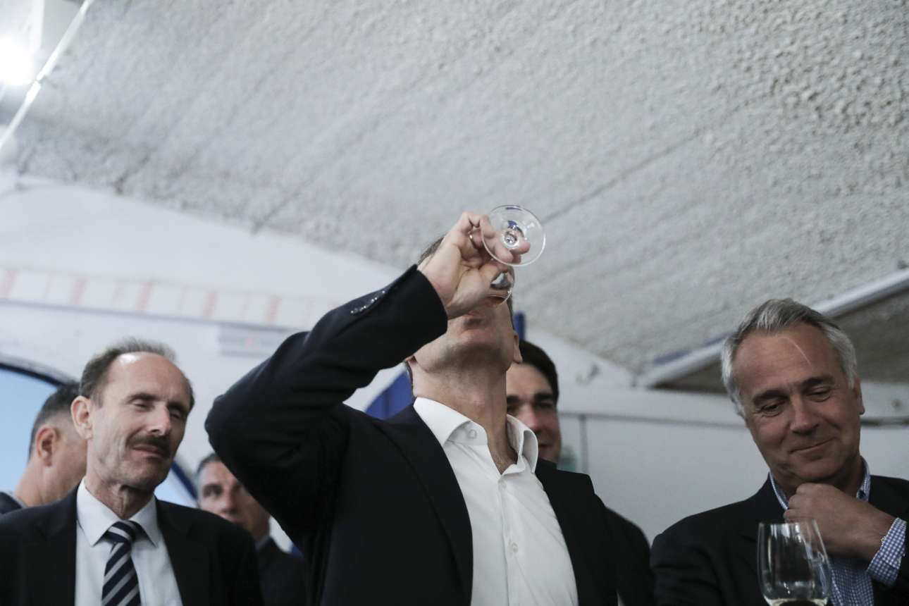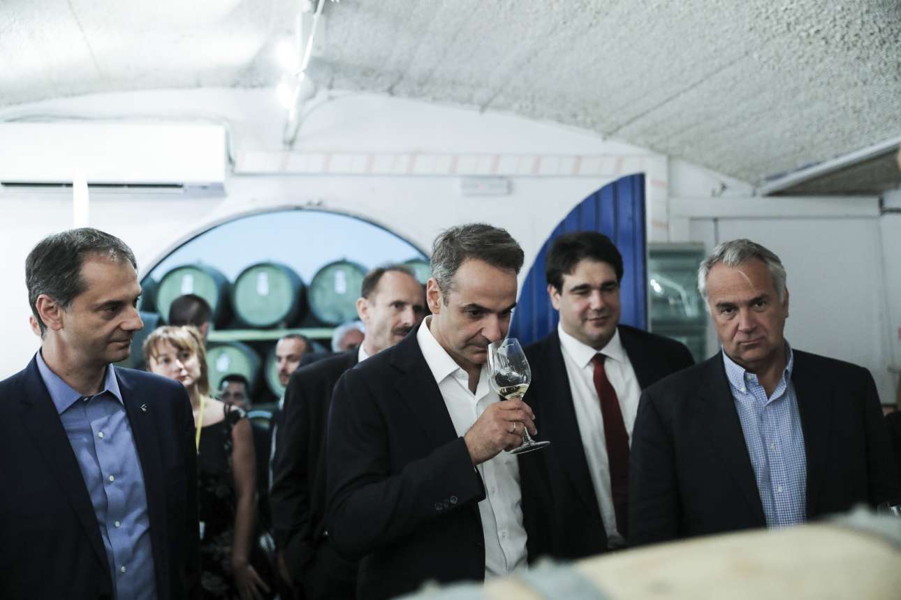 Wine testing: Δοκιμάζοντας τη «μύτη» ενός από τα φημισμένα κρασιά της Σαντορίνης, ανάμεσα στον υπ. Τουρισμού Χάρη Θεοχάρη και τον υπ. Αγροτικής Ανάπτυξης Μάκη Βορίδη