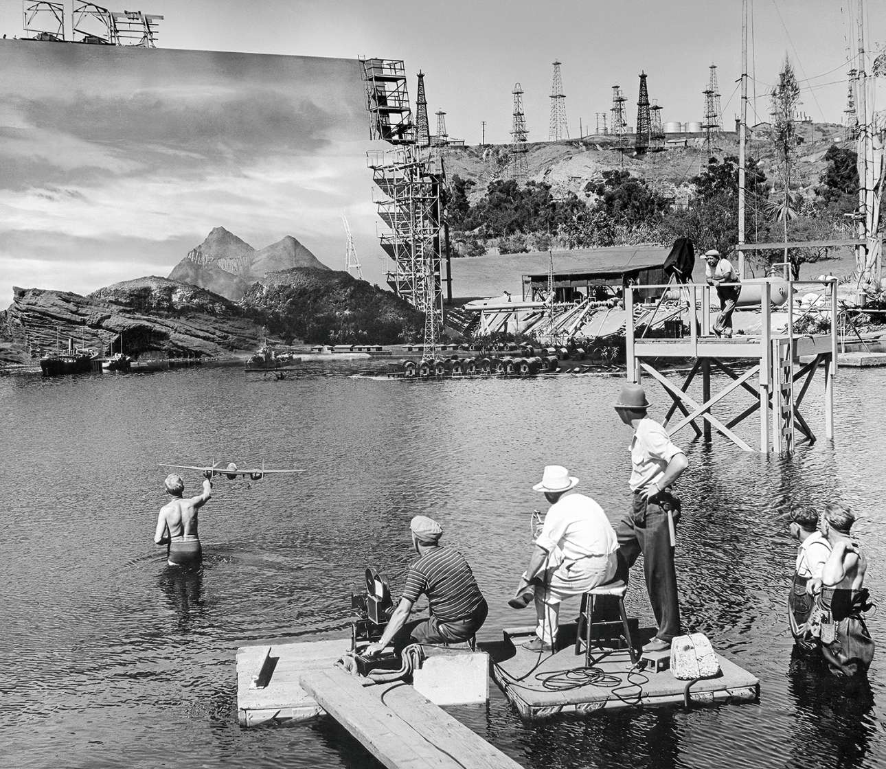 «A guy named Joe» (1943). Στην τεράστια δεξαμενή νερού της MGM, ένα συνεργείο ειδικών εφέ ενορχηστρώνει τον βομβαρδισμό μιας μινιατούρας ιαπωνικής αποθήκης πυρομαχικών του Β' Παγκοσμίου Πολέμου για την πολεμική ταινία. Η αρχική λεζάντα του Life σημείωνε ότι το μοντέλο αεροπλάνου P-38 «χαλάει την αποστολή επειδή τα καλώδια δεν είναι αρκετά τεντωμένα. Ενας άνδρας βγαίνει έξω για να το σώσει, ενώ ο σκηνοθέτης περιμένει υπομονετικά σε μια σχεδία και ο εικονολήπτης είναι σε ετοιμότητα στην πλατφόρμα δεξιά». MGM Studios, 1943