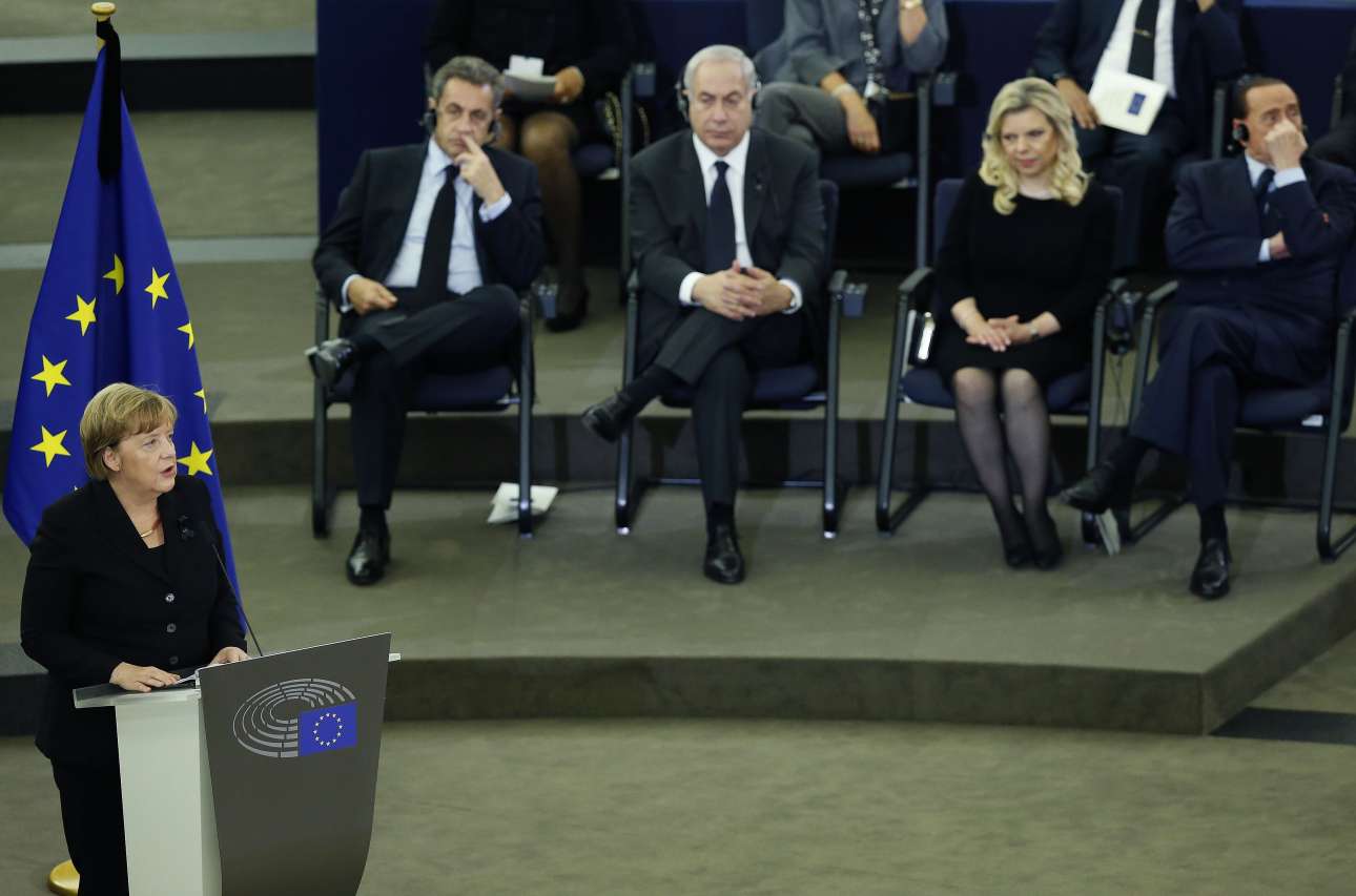 Η Ανγκελα Μέρκελ εκφωνεί μία από τις ομιλίες. Πίσω της ο Νικολά Σαρκοζί, ο Μπένιαμιν Νετανιάχου με τη σύζυγό του και ο Σίλβιο Μπερλουσκόνι