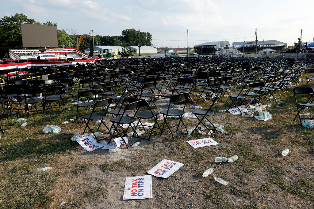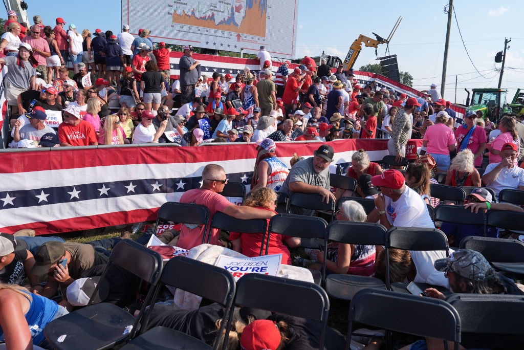 Μερικοί οπαδοί του Τραμπ παραμένουν χωμένοι κάτω από τις καρέκλες που είχαν στηθεί στον χώρο, μετά την παύση των πυροβολισμών και το άδοξο τέλος της εκδήλωσης