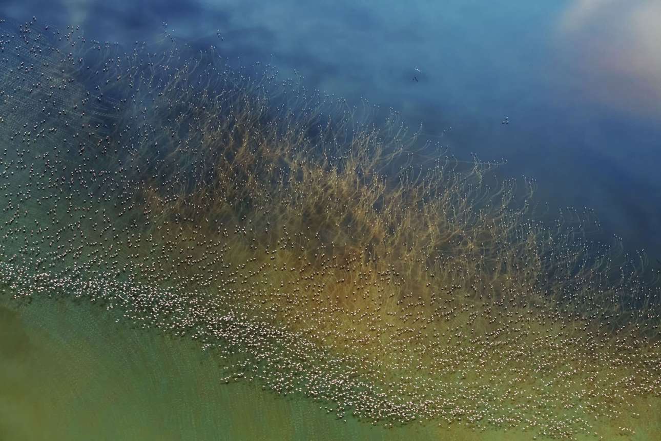 «Φλαμίνγκο Απογειώνονται». Δεύτερη θέση στην κατηγορία Φύση. «Χιλιάδες φλαμίνγκο απογειώνονται από την πολύχρωμη λίμνη Νατρόν στην Τανζανία. Καθώς τρέχουν στα ρηχά για να αναπτύξουν ταχύτητα, τα μακριά κόκκινα πόδια τους σχηματίζουν πτυχώσεις στην επιφάνεια της λίμνης, οι οποίες από το ελικόπτερο μοιάζουν σαν πελώρια υδρόβια φυτά που επιπλέον στο νερό»