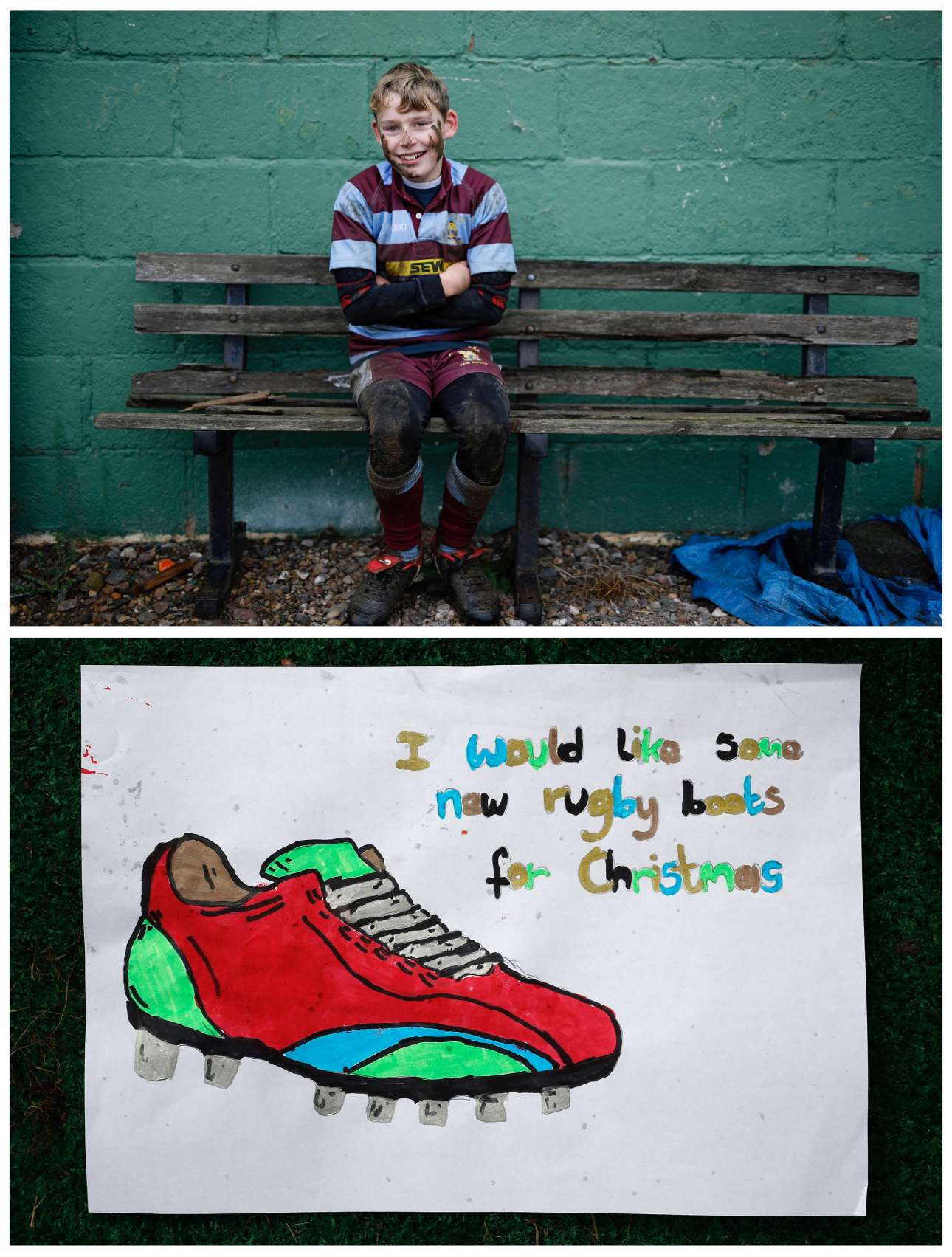 «Ο παππούς μου, ο οποίος με πηγαίνει στους αγώνες ράγκμπι, μου είπε να ζητήσω μπαστούνια του γκολφ για εκείνον, αλλά εγώ θα ήθελα πολύ ένα καινούργιο ζευγάρι παπουτσιών ράγκμπι για τα Χριστούγενννα» παραδέχεται ο βρετανός λάτρης του ράγκμπι Γουίλιαμ, 11 χρονών, ποζάροντας χαμογελαστός και λασπωμένος μετά από παιχνίδι