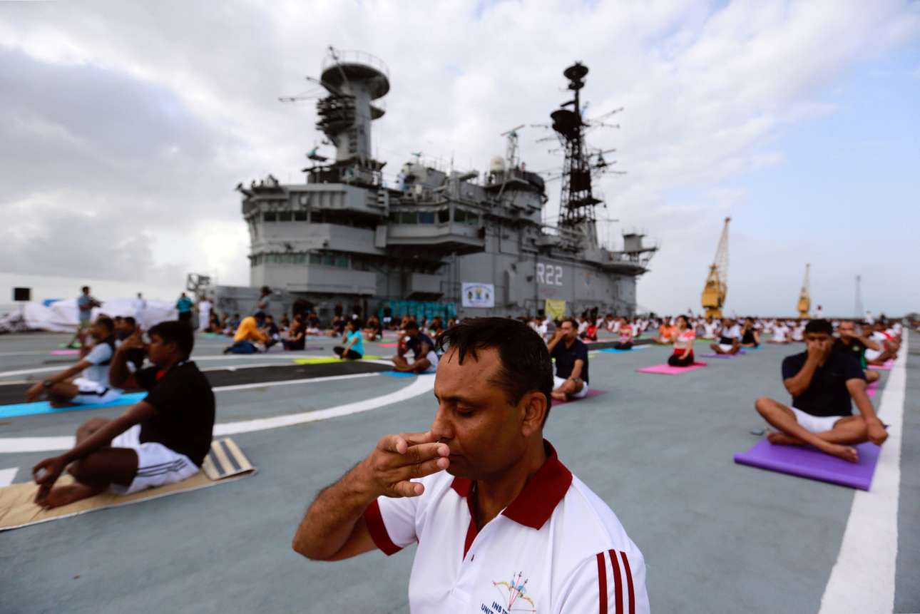 Γιόγκα στην πίστα ενός αεροπλανοφόρου. Οκ, το «INS Viraat» είναι παροπλισμένο, όμως σε μια ένδειξη του πόσο σημαντική είναι η γιόγκα για τους Ινδούς το Πολεμικό Ναυτικό το παραχώρησε για να απολαύσει ο κόσμος τις ασκήσεις του στο λιμάνι της Βομβάης (Μουμπάι)