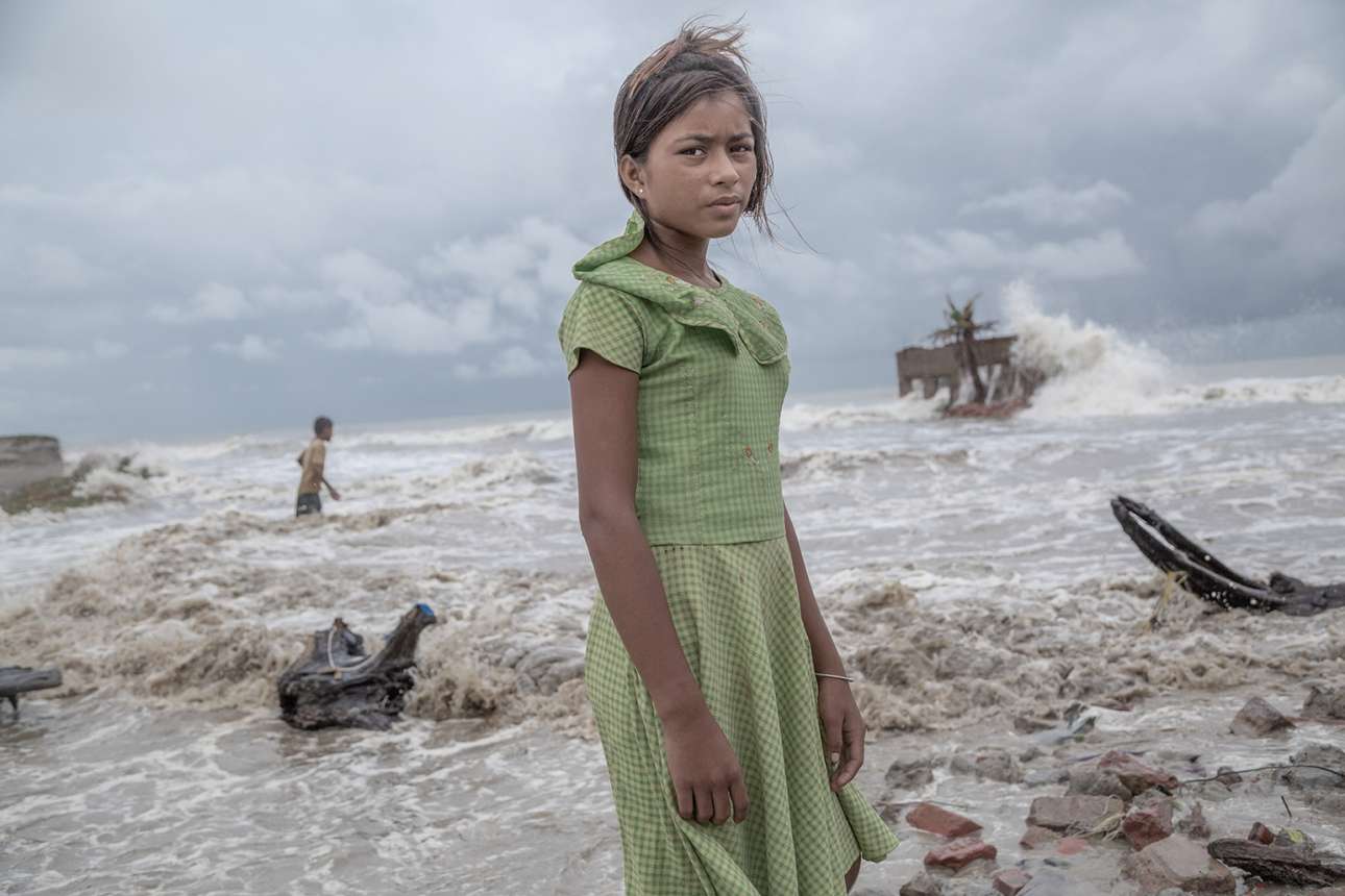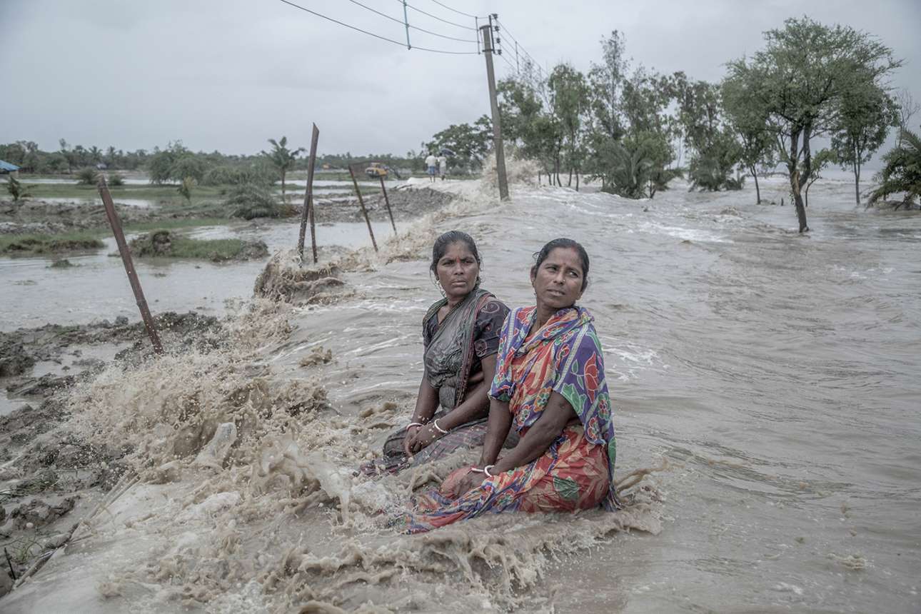 Ιδιαίτερος έπαινος στην κατηγορία Ανθρωποι. Δυο γυναίκες παρακολουθούν αβοήθητες τα κύματα της θάλασσας να κυριεύουν τα σπίτια τους στο αρχιπέλαγος Σουνταρμπάνς, που εκτείνεται στα σύνορα της Ινδίας με το Μπαγκλαντές - η Ινδία διεκδικεί το 40% των 40.000 τ. χλμ. του. Η περιοχή είναι γνωστή για τους πλούσιους δασικούς πόρους της, στους οποίους βασίζεται το εισόδημα των ντόπιων. Ομως η αχαλίνωτη αποψίλωση των δασών σε συνδυασμό με την επιδείνωση των καταιγίδων έχει εντείνει την έλλειψη τροφής και νερού, έχει μειώσει τη γεωργική παραγωγή και την ποιότητα του εδάφους και έχει μετατρέψει τις τοπικές κοινότητες σε κλιματικούς πρόσφυγες
