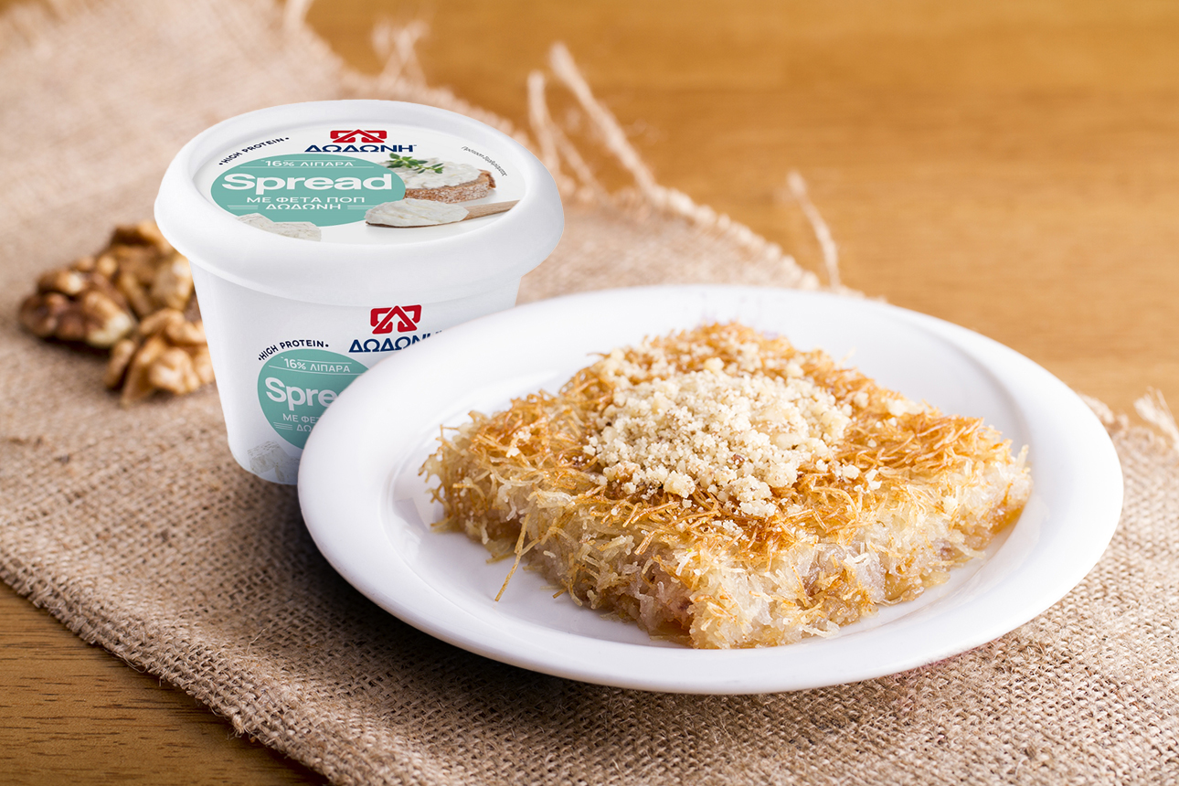 Το ΔΩΔΩΝΗ Spread είναι ιδανικό για όλες τις ώρες της ημέρας, ως άλειμμα στο ψωμί ή συνοδευτικό στο φαγητό. Ετοιμάστε ανοικτά σάντουιτς με φέτες μαύρου ψωμιού αλειμμένες με ΔΩΔΩΝΗ Spread και πασπαλισμένες με ψιλοκομμενο σχοινόπρασο, μαϊντανό, δυόσμο ή βασιλικό. Προσθέστε το ΔΩΔΩΝΗ Spread σε σαλάτες για να συμπληρώνετε τη γεύση και τη διατροφική τους σύνθεση, ενώ μπορείτε επίσης να το χρησιμοποιήσετε στη μαγειρική σας για αλμυρά ή γλυκά πιάτα. Εμείς σας προτείνουμε μια αλμυρή πίτα χωρίς φύλλο, εμπνευσμένη από το χανιώτικο μπουρέκι, και μια γλυκιά πίτα με κανταΐφι, αχλάδι και καρύδια εμπνευσμένη από το κιουνεφέ αλλά πολύ πιο ελαφριά από το ανατολίτικο γλυκό, την οποία συνοδεύουμε με μέλι.