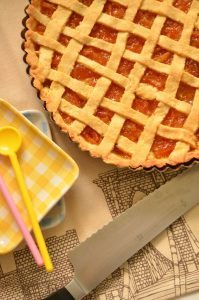 Pasta frolla (τη λένε και crostata di marmellata) σημαίνει τραγανή ζύμη (Shortcrust pastry για τους αγγλομαθείς) στα ιταλικά και τη χρησιμοποιούν για διάφορες παρασκευές, είτε ωμή που ψήνεται μαζί με την μαρμελάδα όπως στην περίπτωσή μας, είτε ψημένη, οπότε γεμίζεται με απαλή κρέμα βανίλια και στολίζεται με φρέσκα φρούτα.