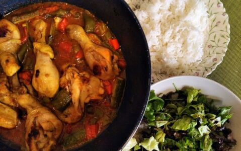 Κοτόπουλο: Κρέας υγιεινό με λίγα λιπαρά και πολλές θρεπτικές ουσίες, που προτείνουν όλοι οι διαιτολόγοι, ευέλικτο στο μαγείρεμα, νόστιμο· αλλά εμένα δεν μ’ αρέσει. Προτιμώ μόνο μπουτάκια και φτερούγες, κι ευτυχώς δεν χρειάζεται πια να αγοράσει κανείς ολόκληρο πουλερικό, στην αγορά βρίσκεις ό,τι κομμάτι θέλεις. Ψάχνω επίσης συνταγές, που το νοστιμίζουν. Και αυτή εδώ είναι πραγματικά από τις καλύτερές μου· εύκολα και γρήγορα έχεις ένα νόστιμο και ζουμερό φαγάκι, που έλκει την καταγωγή του από ένα παραδοσιακό ινδικό πιάτο με κοτόπουλο μαριναρισμένο σε γιαούρτι.