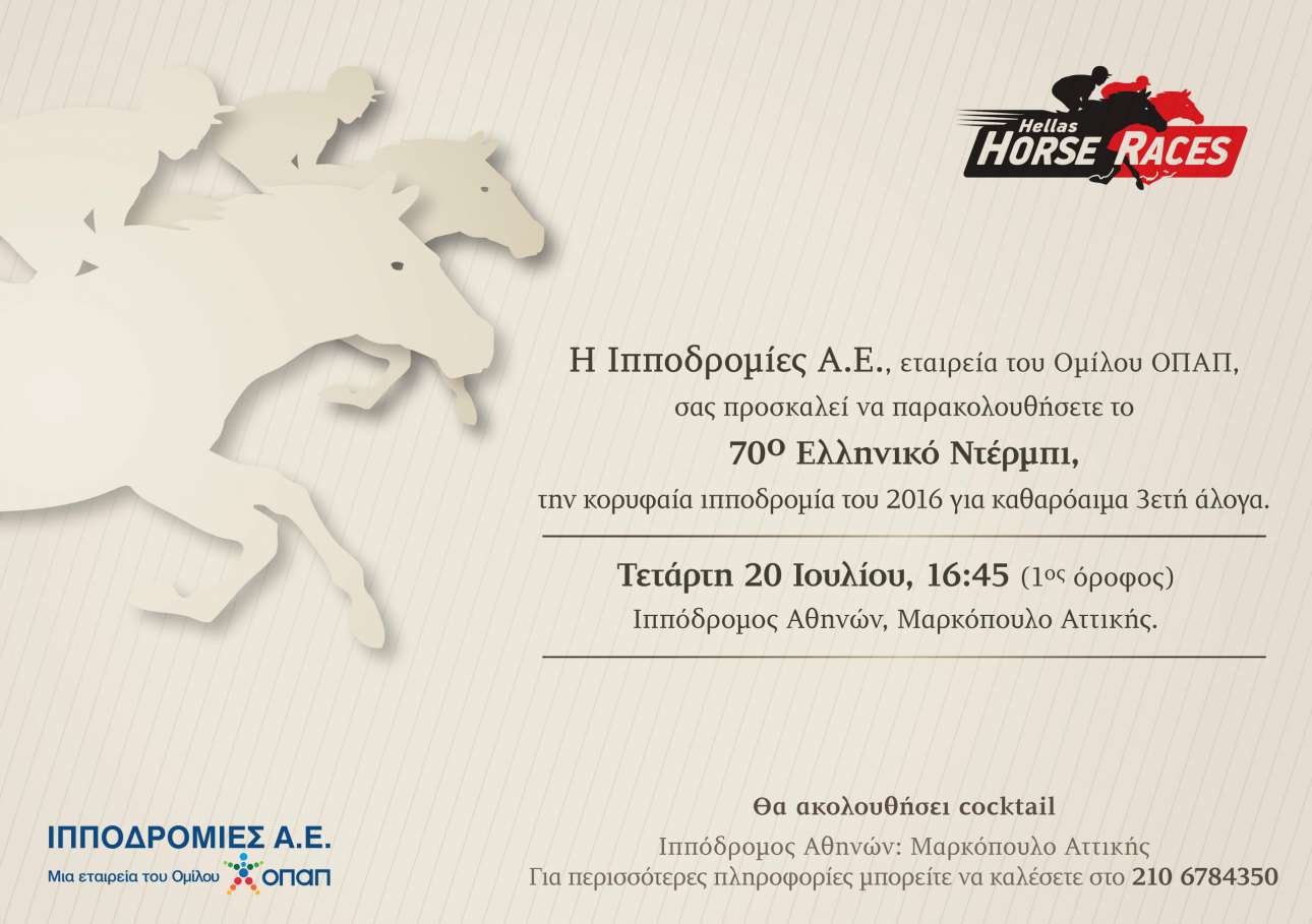 Η Ιπποδρομίες ΑΕ του ΟΠΑΠ έχει μεταμορφώσει τις σύγχρονες εγκαταστάσεις στο Μαρκόπουλο σε εορταστικό χώρο. Αύριο, Τετάρτη 20 Ιουλίου, η γιορτή ξεκινά στις 16:45 και η κορυφαία εκδήλωση, το 70ο ελληνικό ντέρμπι, στις 19:15. Καθαρόαιμα άλογα τριών ετών θα τρέξουν απόσταση 2.400 μέτρων διεκδικώντας το κύπελλο. H είσοδος είναι δωρεάν για όλους και θα υπάρχει συνεχής δωρεάν μεταφορά με πούλμαν από και προς τους σταθμούς του ΜΕΤΡΟ στο Κορωπί.