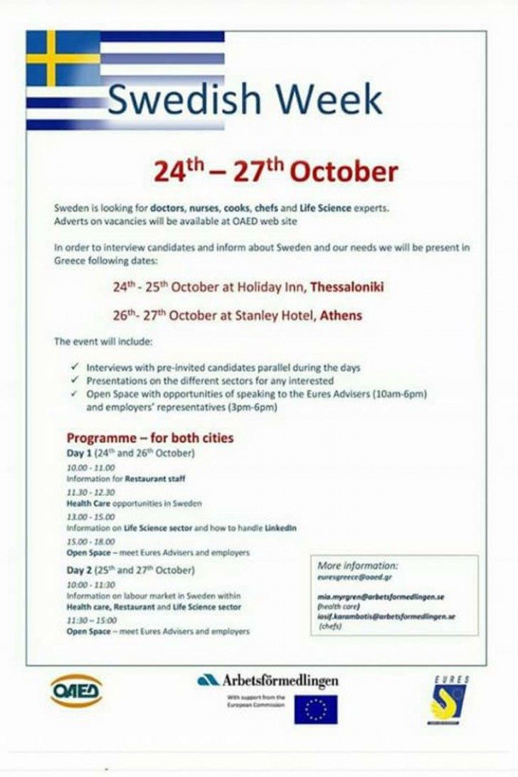 Η ευρωπαϊκή πύλη για την επαγγελματική κινητικότητα Eures, σε συνεργασία με τον ΟΑΕΔ, ανακοίνωσε διαθέσιμες θέσεις εργασίας στη Σουηδία για νοσηλευτές, γιατρούς και μάγειρες από την Ελλάδα. Οι υποψήφιοι που επιθυμούν να εργαστούν στη Σουηδία μπορούν να επισκεφτούν τη σελίδα του ΟΑΕΔ (www.oaed.gr) για τις σχετικές πληροφορίες. Η αξιολόγησή τους θα γίνει στη Θεσσαλονίκη στις 24 και 25 Οκτωβρίου και στην Αθήνα στις 26 και 27 Οκτωβρίου.