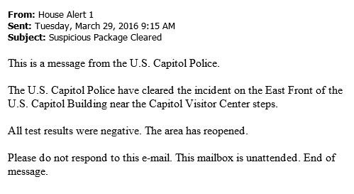 Η γραμματεία του Καπιτωλίου απέστειλε προς το προσωπικό της e-mail στο οποίο αναφέρει πως οι αρχές ασφάλισαν την περιοχή, έλεγξαν το πρώτο ύποπτο δέμα, το οποίο δεν περιείχε εκρηκτικά, και το απομάκρυναν.