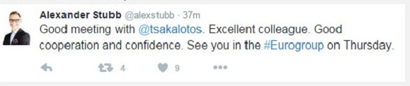 Αφού έπεισε και τον σκληροτράχηλο Αλεξάντερ Στουμπ, δεν θα πρέπει να φοβάται τίποτα ο Ευκλείδης Τσακαλώτος. Αμέσως μετά τη συνάντησή τους, ο Φινλανδός ΥΠΟΙΚ έκανε σχετική ανάρτηση στο Twitter όπου την χαρακτήρισε «καλή και με εμπιστοσύνη», ενώ για τον έλληνα ομόλογό του έγραψε πως είναι «εξαιρετικός συνάδελφος». Το επόμενο ραντεβού τους θα είναι στο Eurogroup της Πέμπτης.
