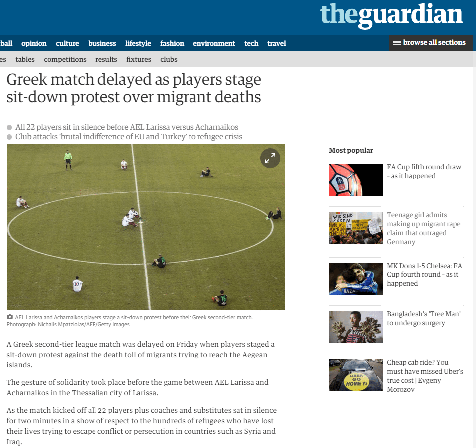 Η κίνηση της ΑΕΛ και του Αχαρναϊκού για καθιστική διαμαρτυρία με αφορμή τους θανάτους των προσφύγων και μεταναστών στο Αιγαίο έγινε είδηση στον Guardian, καθώς το βρετανικό Μέσο βρήκε ενδιαφέρουσα αυτή τη μορφή ευαισθητοποίησης του κόσμου και την προβάλει μέσα από το site του.