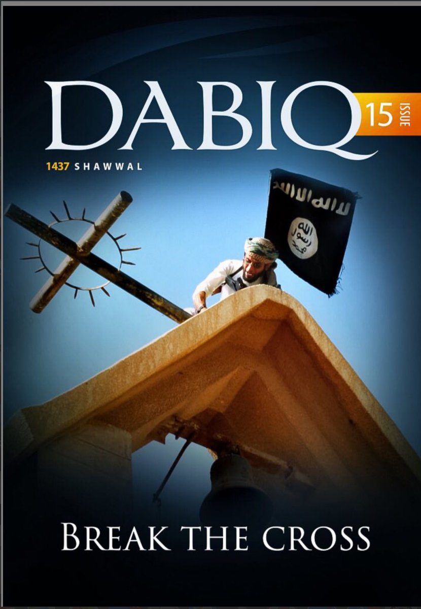 Το 15ο τεύχους του Dabiq, του προπαγανδιστικού περιοδικού του Ισλαμικού Κράτους, έχει τίτλο «Break the Cross» («Σπάστε τον Σταυρό») και καταφέρεται κατά του Χριστιανισμού και του Δυτικού Κοσμικισμού. Το περιοδικό επιχαίρει για τις πρόσφατες επιθέσεις στο Ορλάντο, τη Νορμανδία, τη Γερμανία και το Μπαγκλαντές, ενώ δεν παραλείπει να απευθύνει κάλεσμα στους «κρυμμένους» μαχητές του ISIS στην Ευρώπη για νέες επιθέσεις.