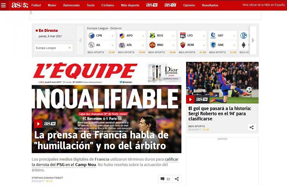 Η ισπανική AS μεταφέρει τα ρεπορτάζ των γαλλικών εφημερίδων γράφοντας: «Ο γαλλικός Τύπος μιλάει για ταπείνωση και όχι για διαιτητικά λάθη».