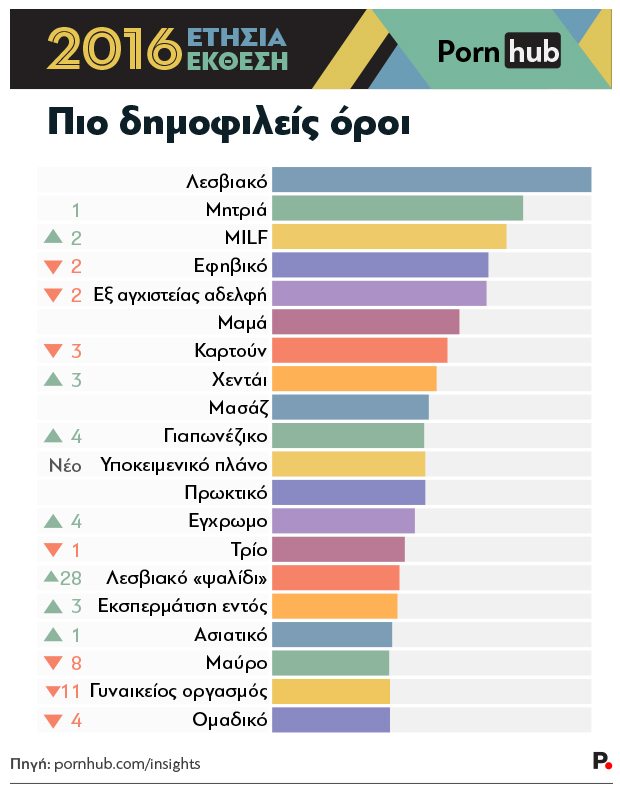 Το λεσβιακό σεξ για δεύτερη χρονιά είναι το Νο 1 σε παγκόσμια αναζήτηση! Ακολουθεί η κατηγορία «Μητριά» και μετά η «MILF» (Mother I’d like to fuck). Η λεσβιακή κατηγορία «Ψαλίδι» το 2016 ήταν η πιο δυναμικά ανερχόμενη σε προτιμήσεις – ανέβηκε 28 θέσεις και μπήκε στην τοπ εικοσάδα. Νέα κατηγορία, που φέτος μπήκε για πρώτη φορά στην εικοσάδα και βρέθηκε κατευθείαν στη 10η θέση είναι το «Overwatch» – τα βίντεο που δείχνουν βασικά σκηνές πεολειχίας σε υποκειμενικό πλάνο αυτού που τη δέχεται. Η κατηγορία «Overwatch» έγινε το 2016 πολύ δημοφιλής χάρη στο βίντεο παιχνίδι προσομοίωσης που κυκλοφόρησε την ίδια χρονιά. «Το τυπικό μέσα-έξω μάλλον έχει τελειώσει», σύμφωνα με την σεξοθεραπεύτρια Δρ Λόρι Μπετίτο, συγγραφέα του «The Sex Bible for People Over 50». «Θέλετε από βαρεμάρα, θέλετε από περιέργεια, οι μάζες δεν ικανοποιούνται πλέον με τα απλά πράγματα. Το σεξ που ξέραμε ως τώρα, αντικαθίσταται από το φαντασιακό ή από το σεξ με συγκεκριμένο σενάριο».