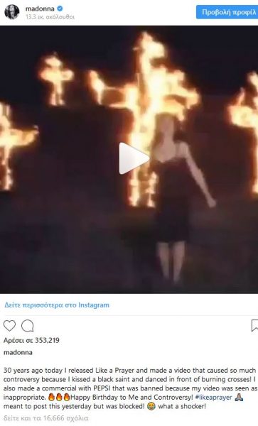 «Πριν από 30 χρόνια κυκλοφόρησα το Like A Prayer και αυτό το βίντεο προκάλεσε τόσο μεγάλη διαμάχη επειδή φίλησα έναν μαύρο άγιο και χόρεψα μπροστά από φλεγόμενους σταυρούς. Επίσης, έφτιαξα μία διαφήμιση με την PEPSI που απαγορεύθηκε γιατί το βίντεό μου χαρακτηρίσθηκε ως ακατάλληλο. Χρόνια πολλά σε μένα και τη διαμάχη!», έγραψε.