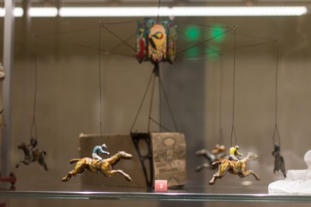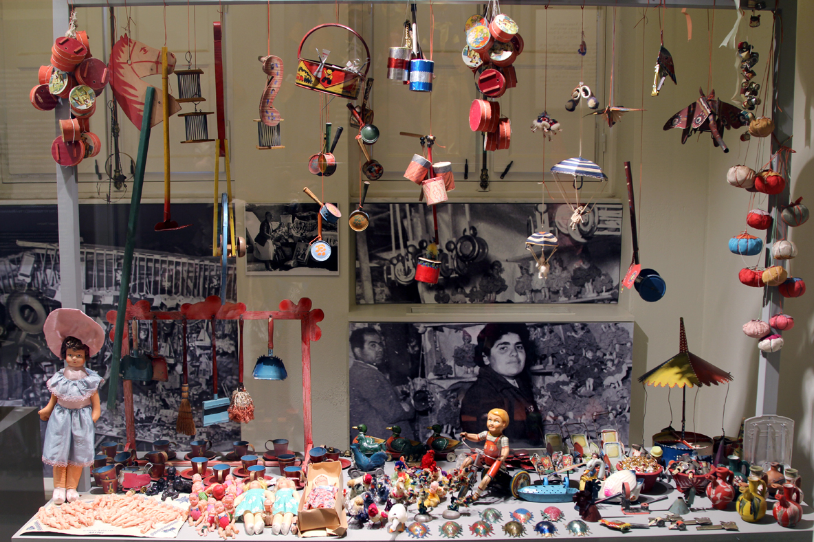 Για τις πορσελάνινες μινιατούρες, τα μηχανικά και οπτικά παιχνίδια, τα τσίγκινα βατραχάκια, τα κοκόρια, τις σκούπες και τα φαρασάκια που πουλούσαν στους πάγκους των πανηγυριών, το κουκλοθέατρο και το θέατρο σκιών, τα στρατιωτάκια, τα τρενάκια, το καταπληκτικό κουκλόσπιτο και το τεράστιο πολεμικό καράβι για τα κάλαντα; Ή μήπως για το γερμανικό peep show του 1830 και την απίθανη στόφα-ξυλόσομπα-μασίνα με τις κατσαρόλες πάνω στα μάτια της;